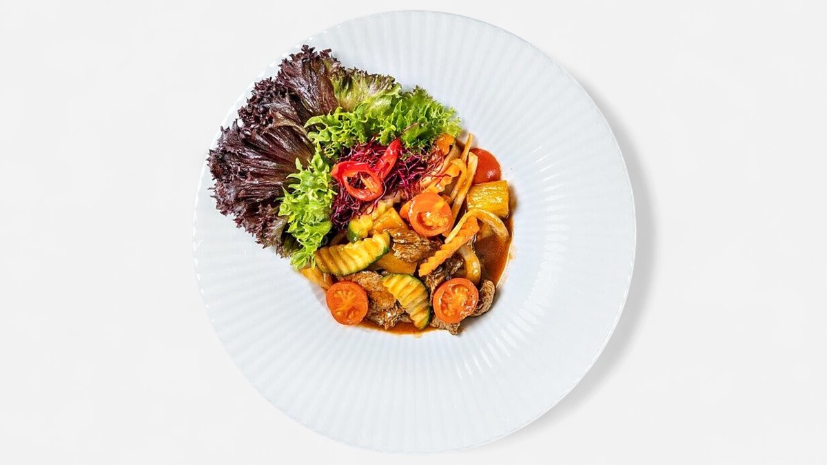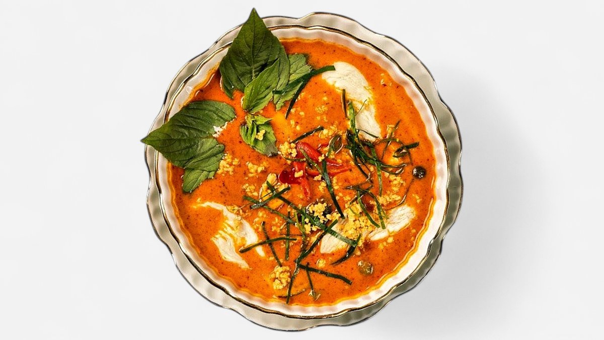 Valgfri protein, bambus, auberginer, lange bønner, sød basilikum og ananas i rød karrysauce. Serveret med ris.