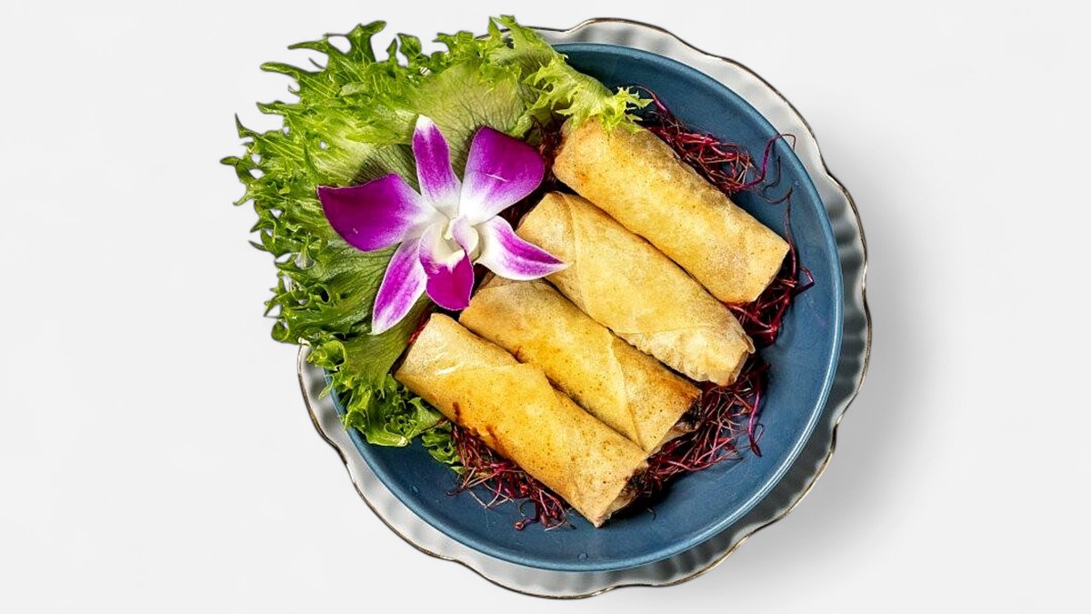 Thai-forårsruller med glasnudler, hvidkål og porre. Serveres med sød chilisauce.