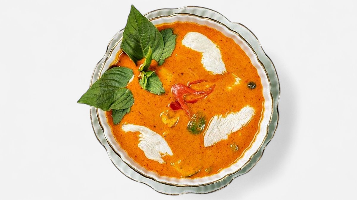 Valgfri protein, peberfrugt, limeblade og gulerødder i panang-karrysauce. Serveret med ris.