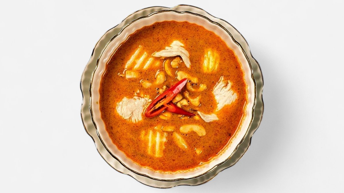 Valgfri protein, cashewnødder, kartofler, rødløg og løg i massaman-karrysauce. Serveret med ris.