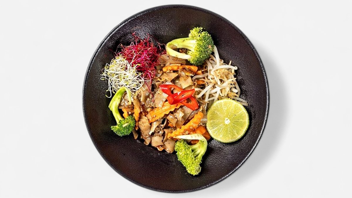 Stegte brede risnudler stegt med valgfri protein, æg, sød soya, broccoli, gulerødder og bønnespirer.