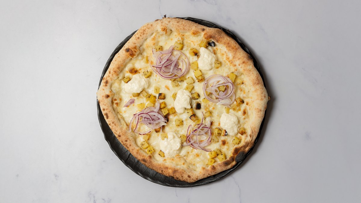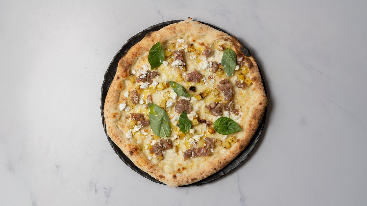 Mascarpone cream, mozzarella, kartofler med rosmarin, salsiccia, gedeost og frisk basilikum.