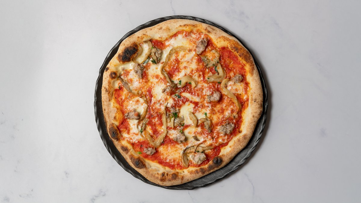 Tomatsauce, mozzarella, østershatte og salsiccia (frisk italiensk pølse).