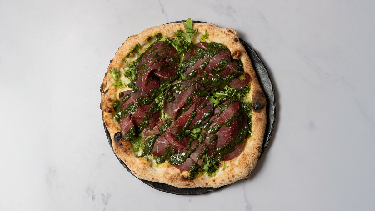 Mascarpone cream, mozzarella, bresaola (luftørret oksefilet), cherry tomater, rucola og pesto.