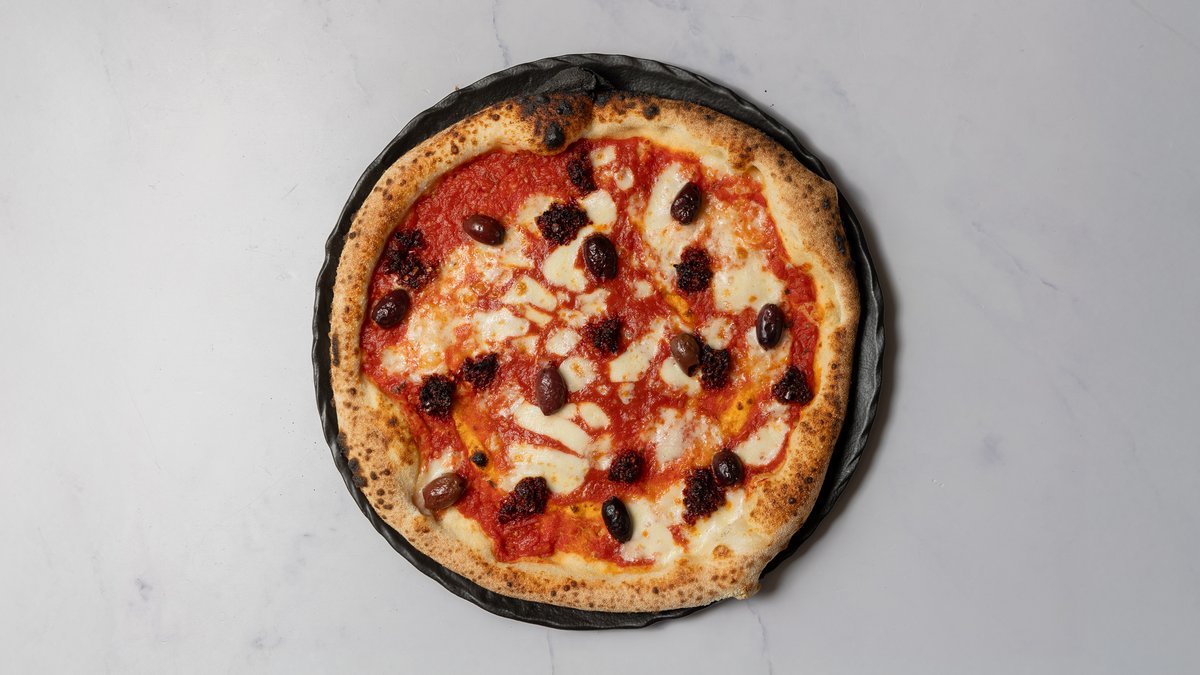 Tomatsauce, mozzarella ''nduja (stærk italiensk pølse paté) og oliven.