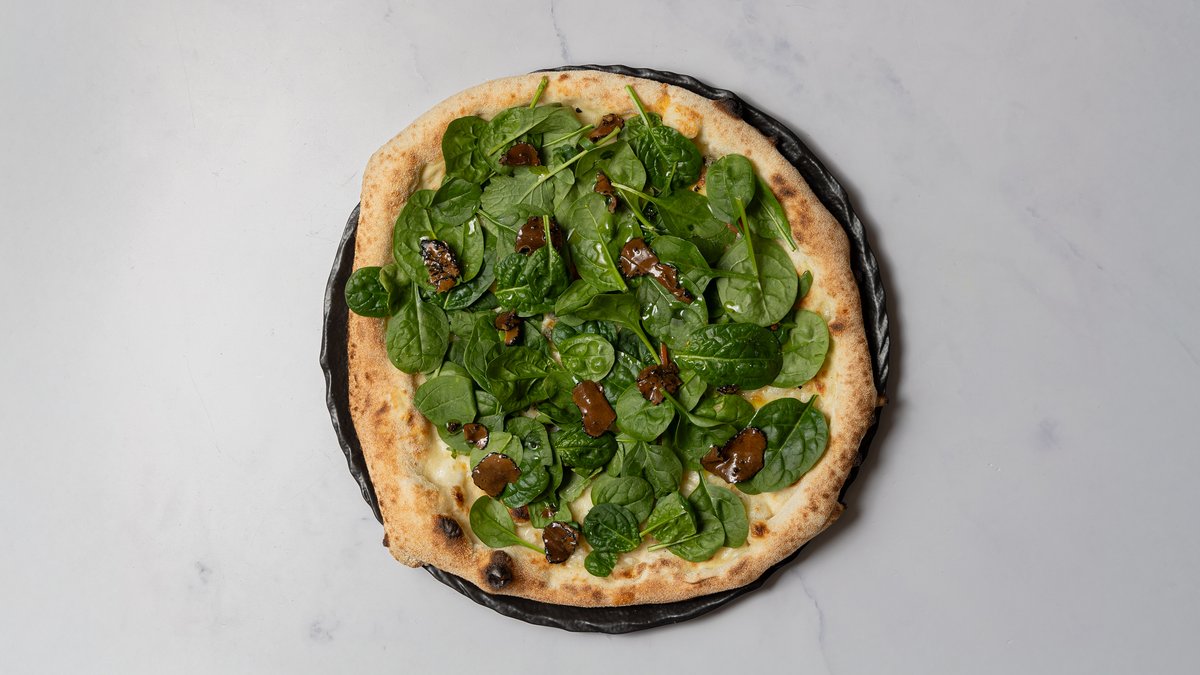 Mascarpone cream, mozzarella, gedeost, frisk spinat og trøffel-flager.