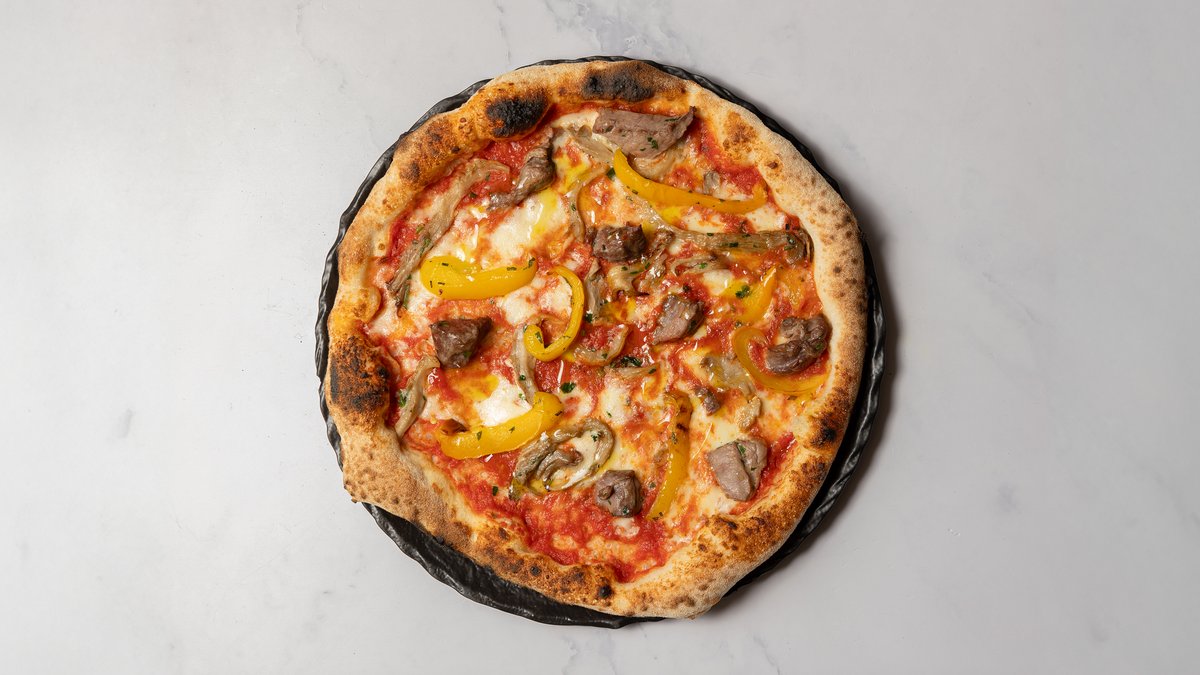 Tomatsauce, mozzarella, oksemørbrad, østershatte og peberfrugt.