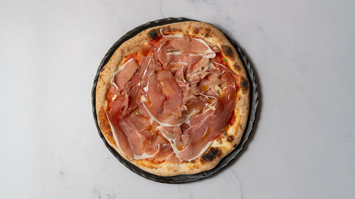 Tomatsauce, mozzarella, parmaskinke, rucola, cherry tomater og parmesanost.