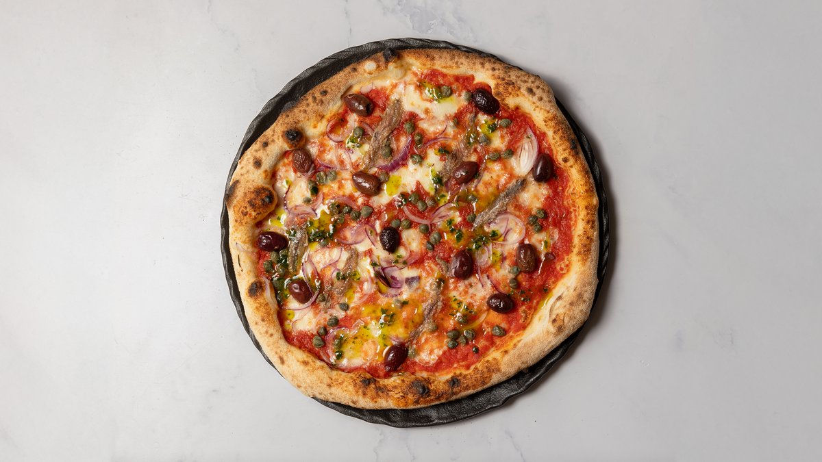 Tomatsauce, mozzarella, ansjoser, kapers, persille, hvidløgsolie, rødløg og oliven.