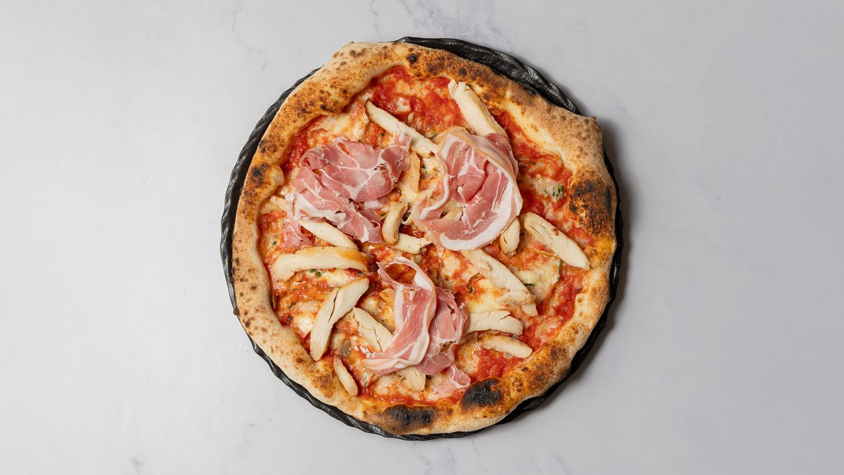 Tomatsauce, mozzarella, kylling og pancetta (italiensk bacon).