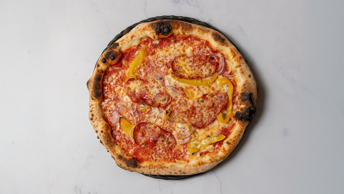 Tomatsauce, mozzarella, peberfrugt, løg scamorza (røget fast ost) og stærk salame.