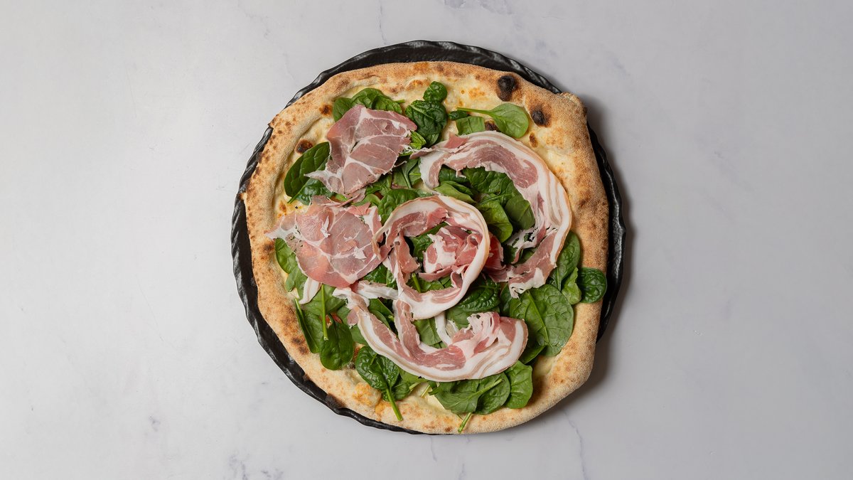 Mascarpone cream, mozzarella, spinat, gorgonzola og pancetta.