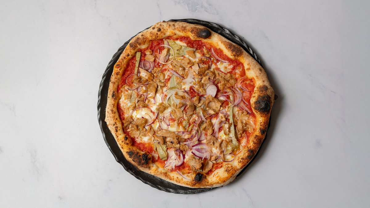 Tomatsauce, mozzarella, siciliansk tun i olie, artiskokker og rødløg.