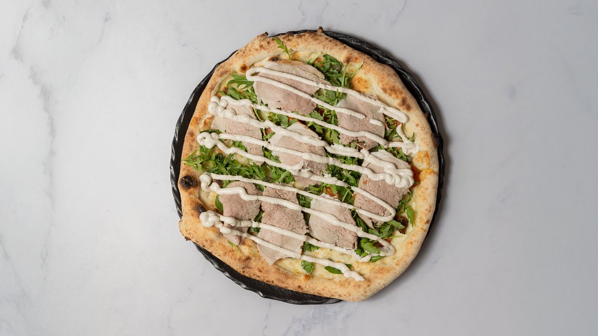 Mascarpone cream, mozzarella, kalvesteg, tunfisk-dressing, rucola, kapers og ovnbagte cherrytomater.