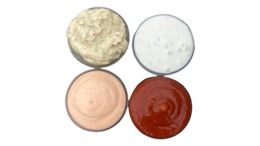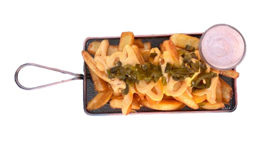 Valgfrit protein, iceberg og peberfrugt. Serveres med pommes frites og en valgfri dip.
