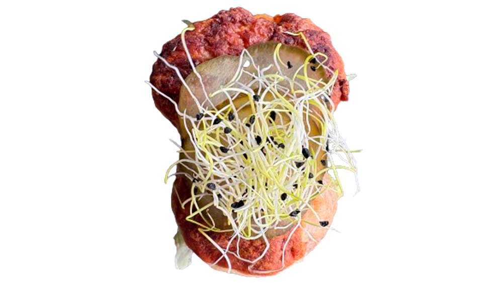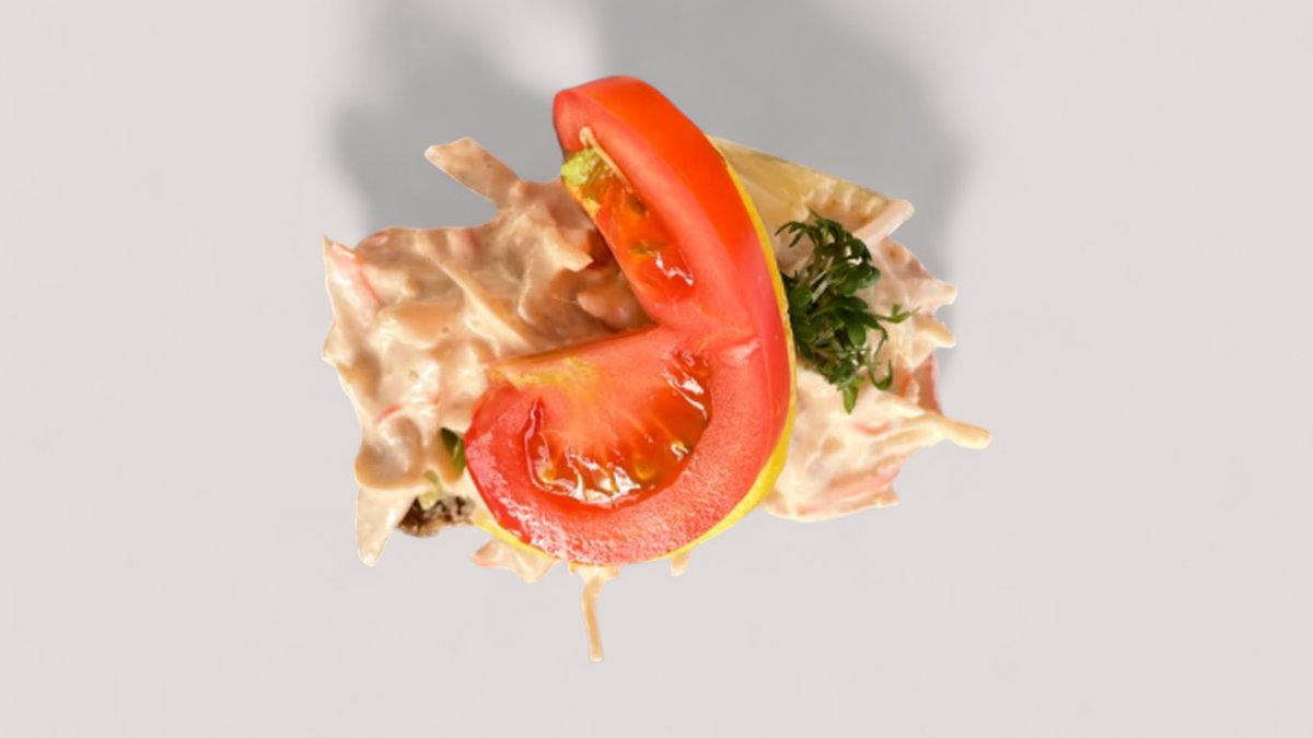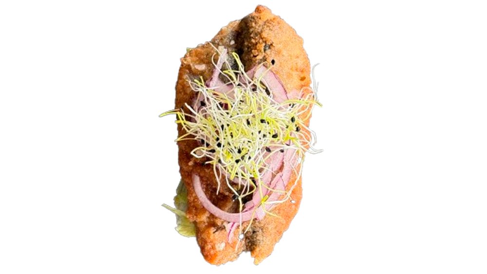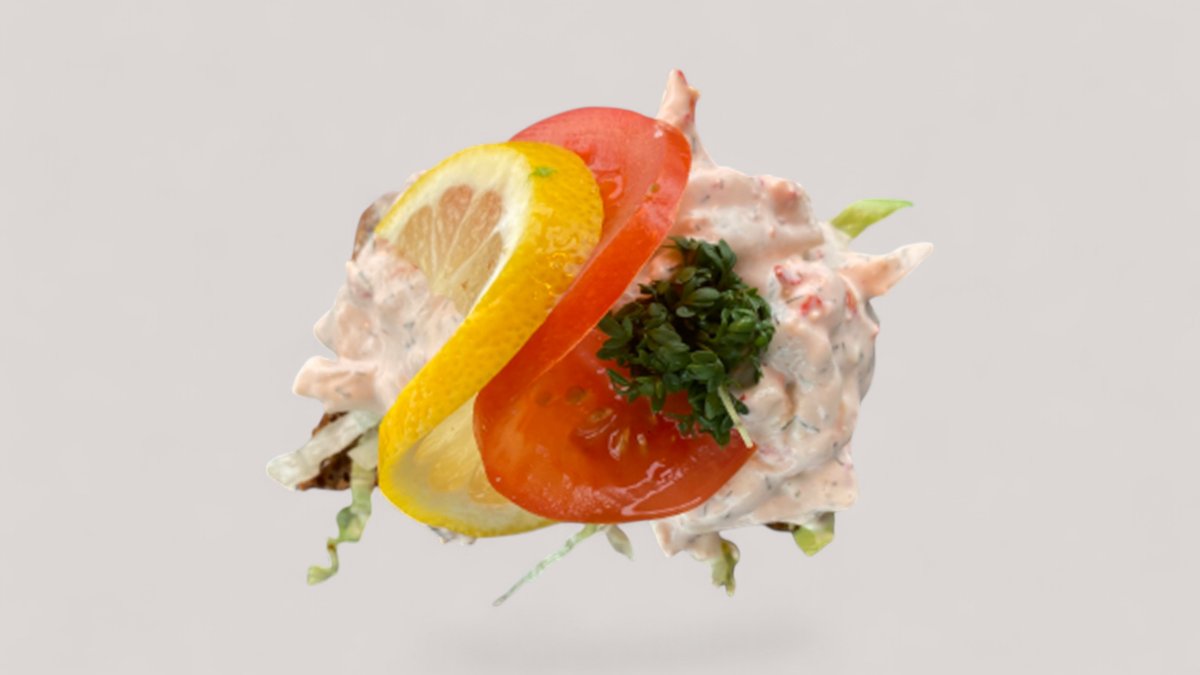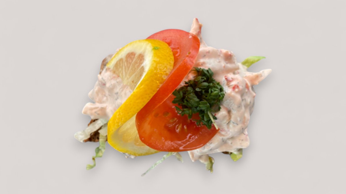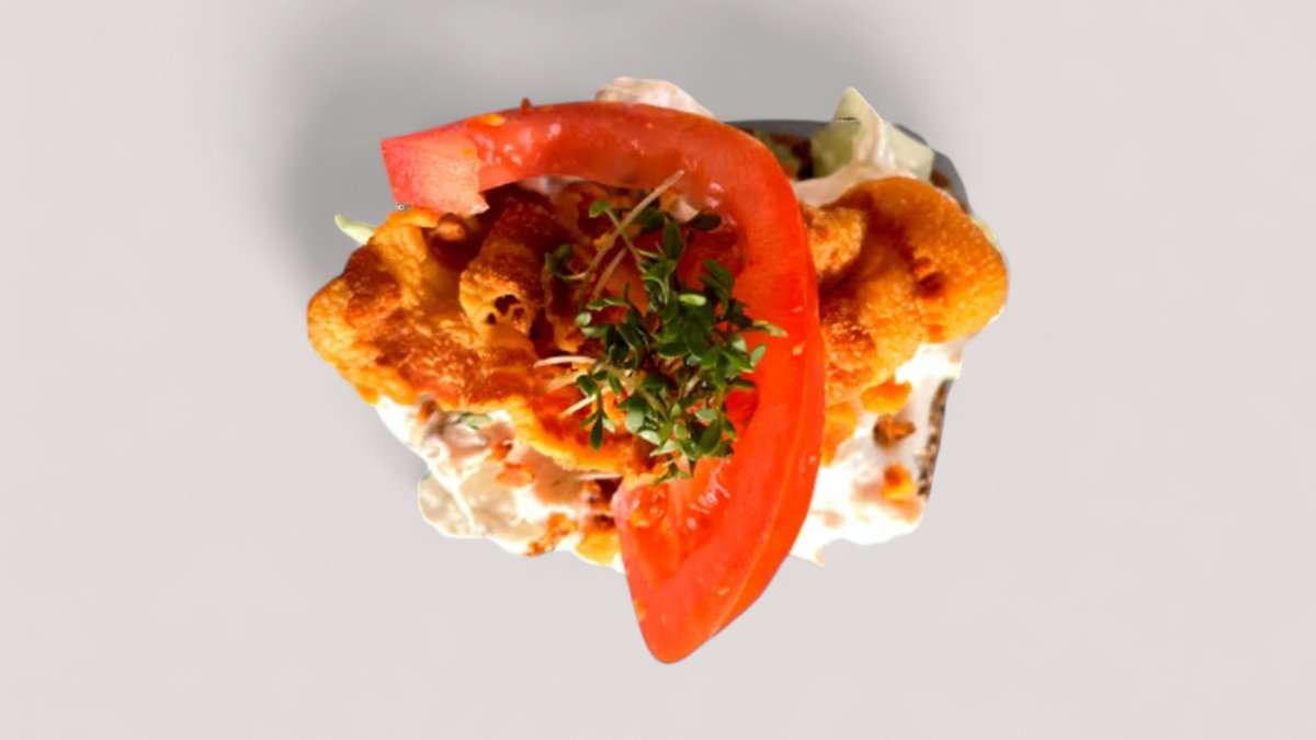 Lun bagel med iceberg salat, peberfrugt og stegt fiskefilet. Serveret med bearnaise creme eller remoulade. Toppet med peberfrugt, hertil pommes frites og valgfri dip.