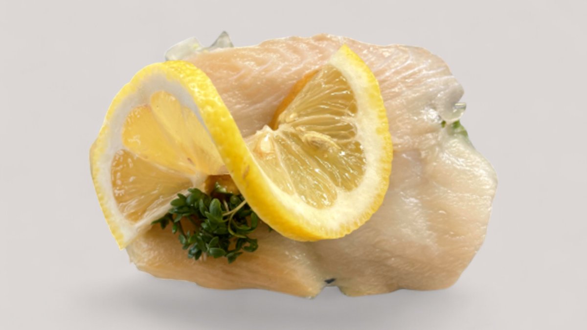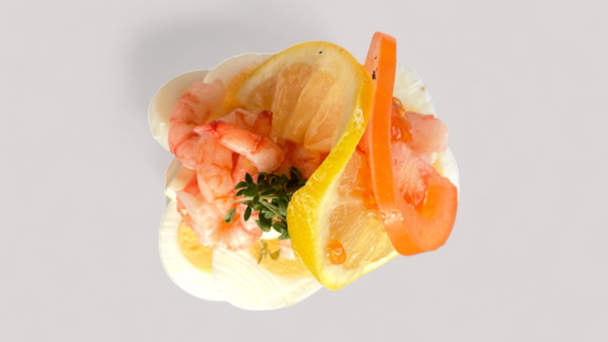 Stegt fiskefilet, toppet med håndpillede rejer asparges, kaviar og citron.