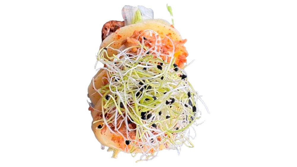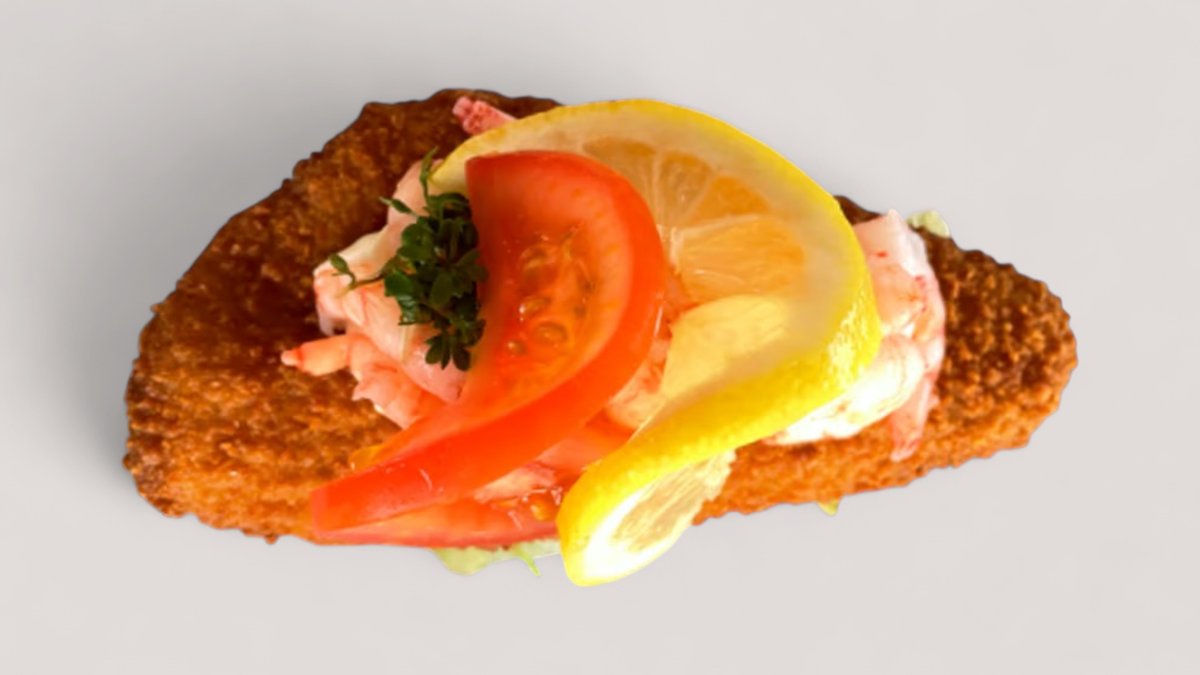 Brioche hotdogbrød med skaldyrssalat. Toppet med friturestegte løg og kaviar.