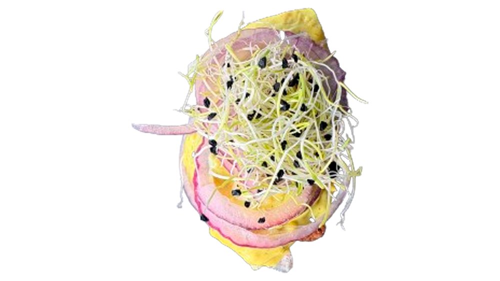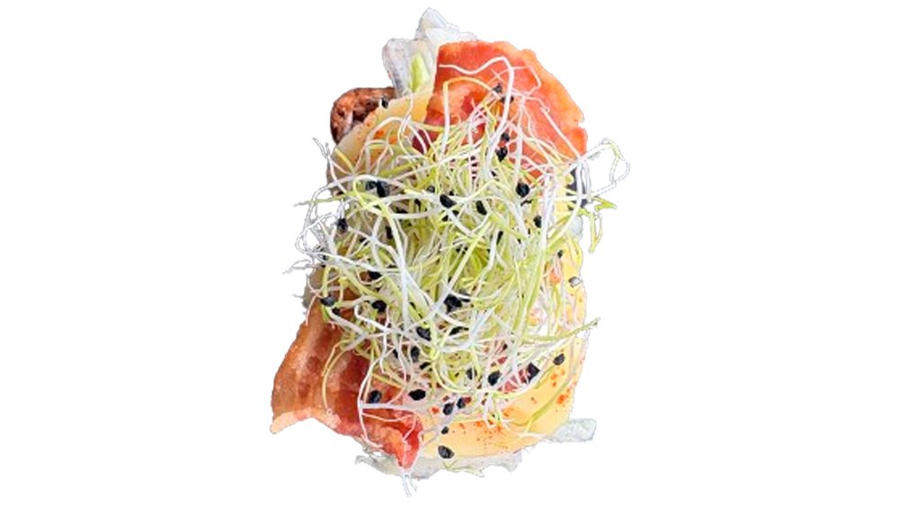 Salat og stegt fiskefilet. Toppet med krabbesalat, koldrøget laks asparges, kaviar og citron.