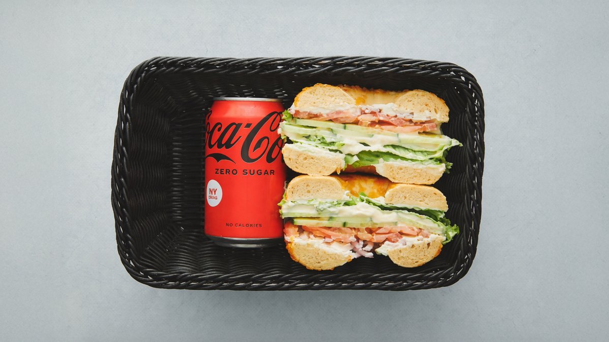 Chilicheddar bagel, smurt med krydret cream cheese og med fyld af salat, tomat, agurk, rødløg, skinke og cheddar. Serveres med en valgfri drikkevare og en cookie.
