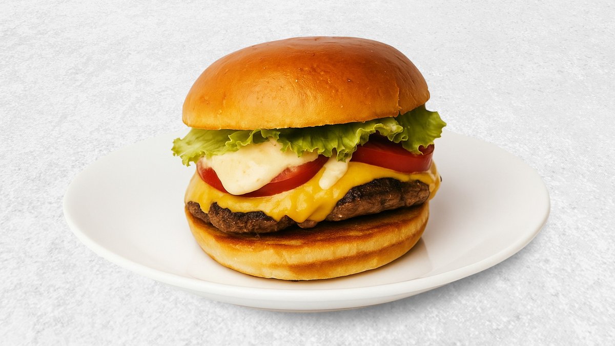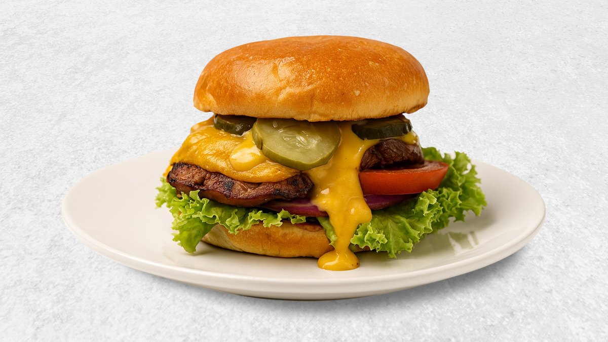 Med fyld af 150 gram flammegrillet bøf, et stykke cheddarost, salat, tomat, løg, pickles og hjemmelavet burgerdressing, toppet med smeltet cheddarost.