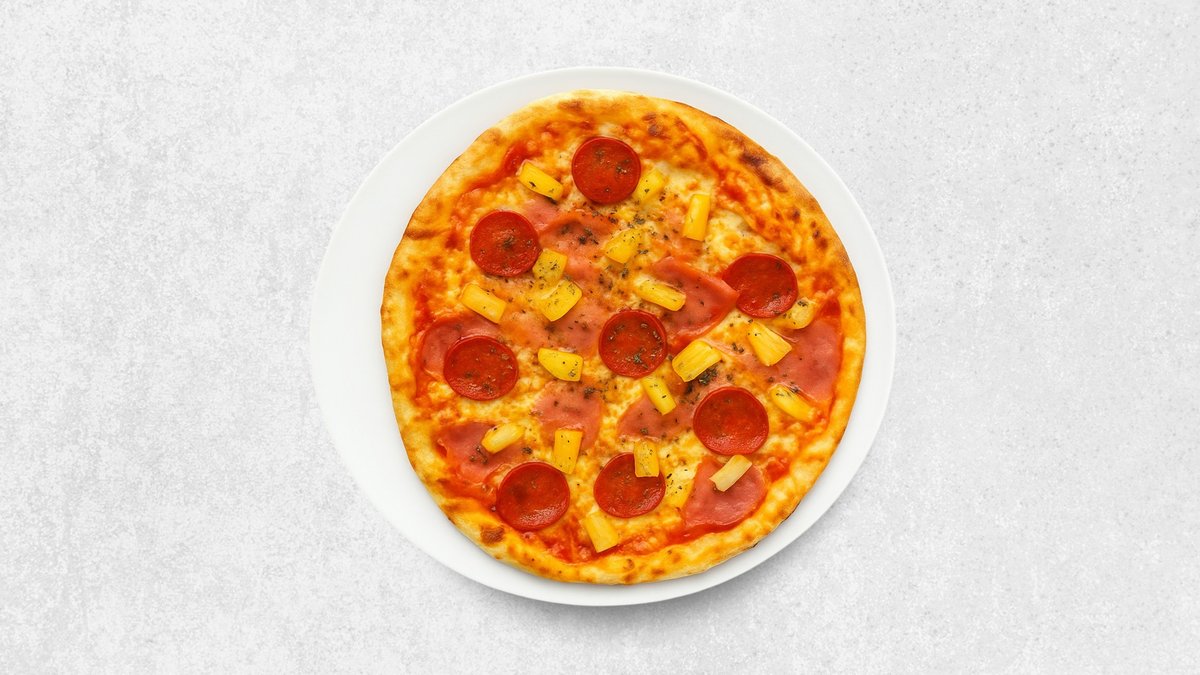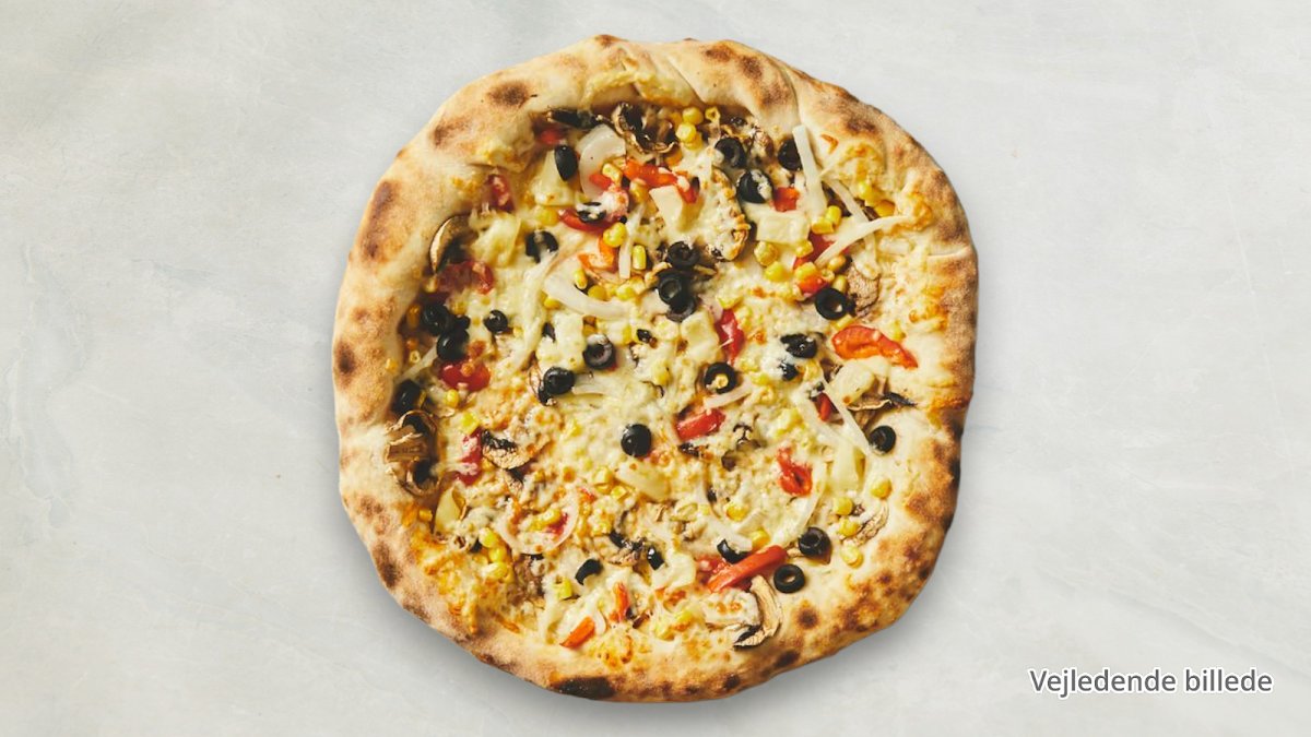 Tomat, ost, champignon, ananas, hvidløg, peberfrugt, sort oliven.