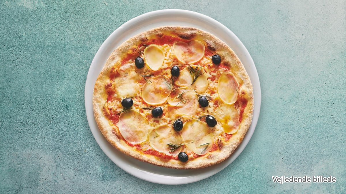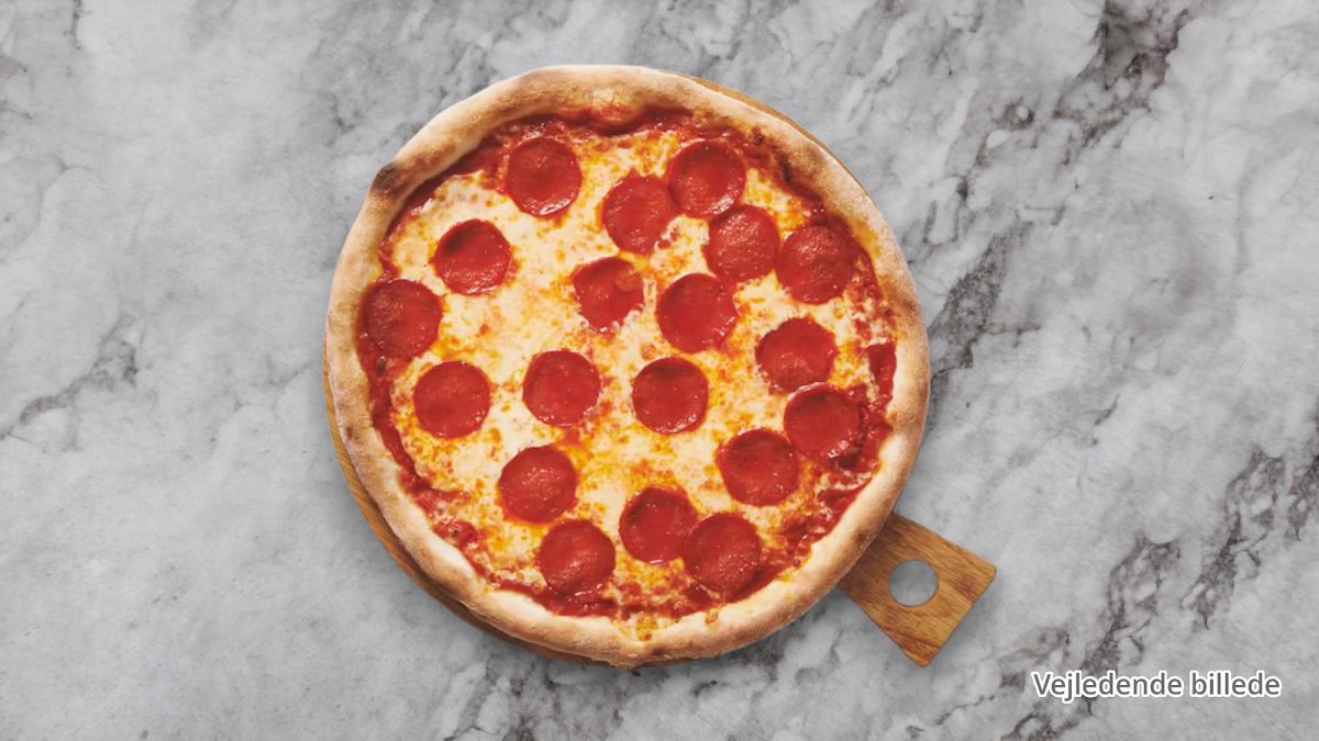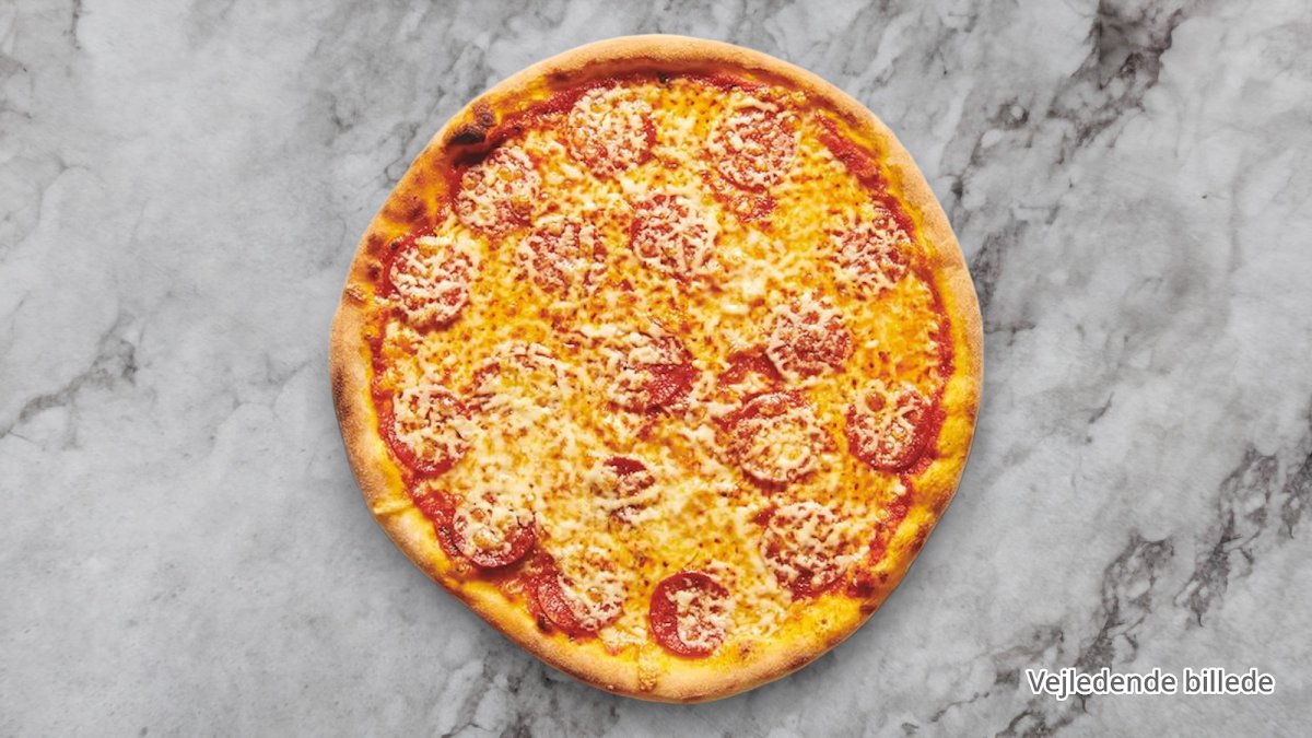 Tomat, ost, stærk salami, flæskesvær, sort oliven.