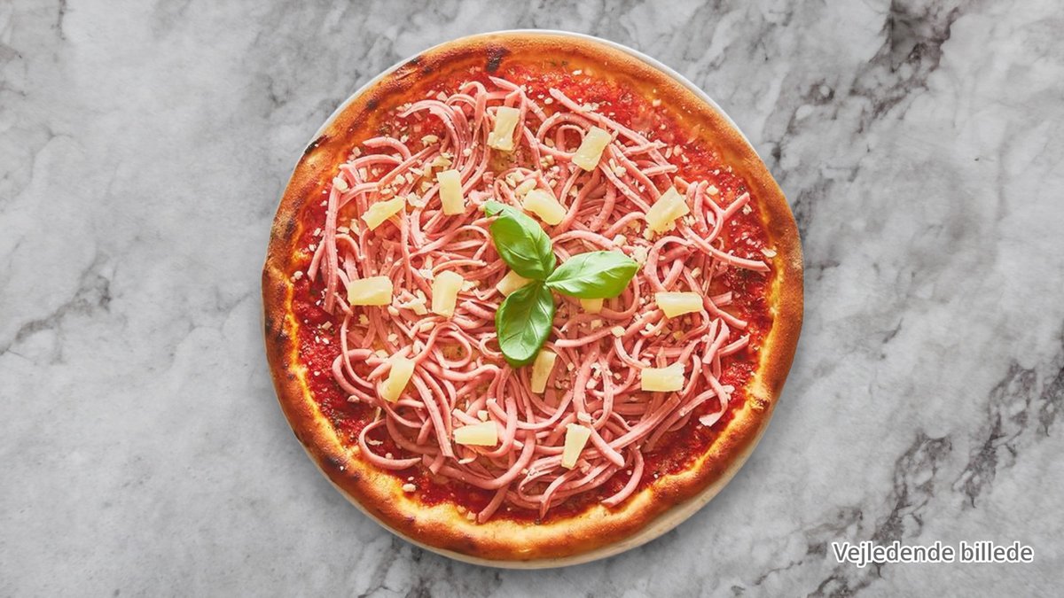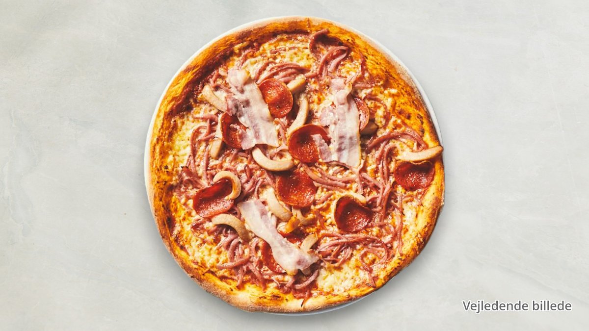 Tomat, ost, italiensk skinke, bacon, pepperoni, løg, cocktailpølser.