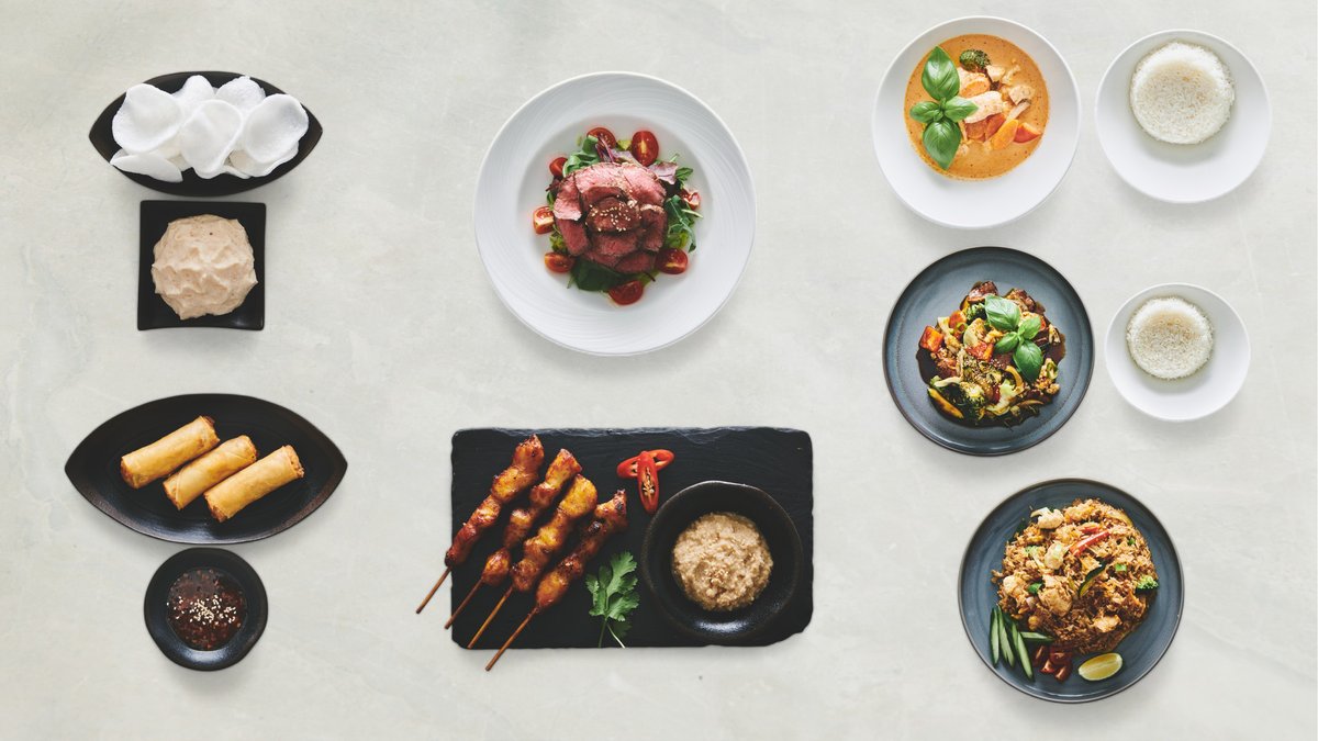 Rejechips med luftig tomatdip. Hjemmelavede forårsruller med svinekød og sød chilidip. Satay Kyllingespyd med jordnøddedip. Grillet oksekød salat med jordnødder, rødløg og spicy dressing. Rød kokoskarry med kylling og grøntsager. Oksekød stegt i wok med peber og hvidløg. Stegte ris med kylling, æg og grøntsager. Jasminris. Serveres med valgfri drikkevarer.