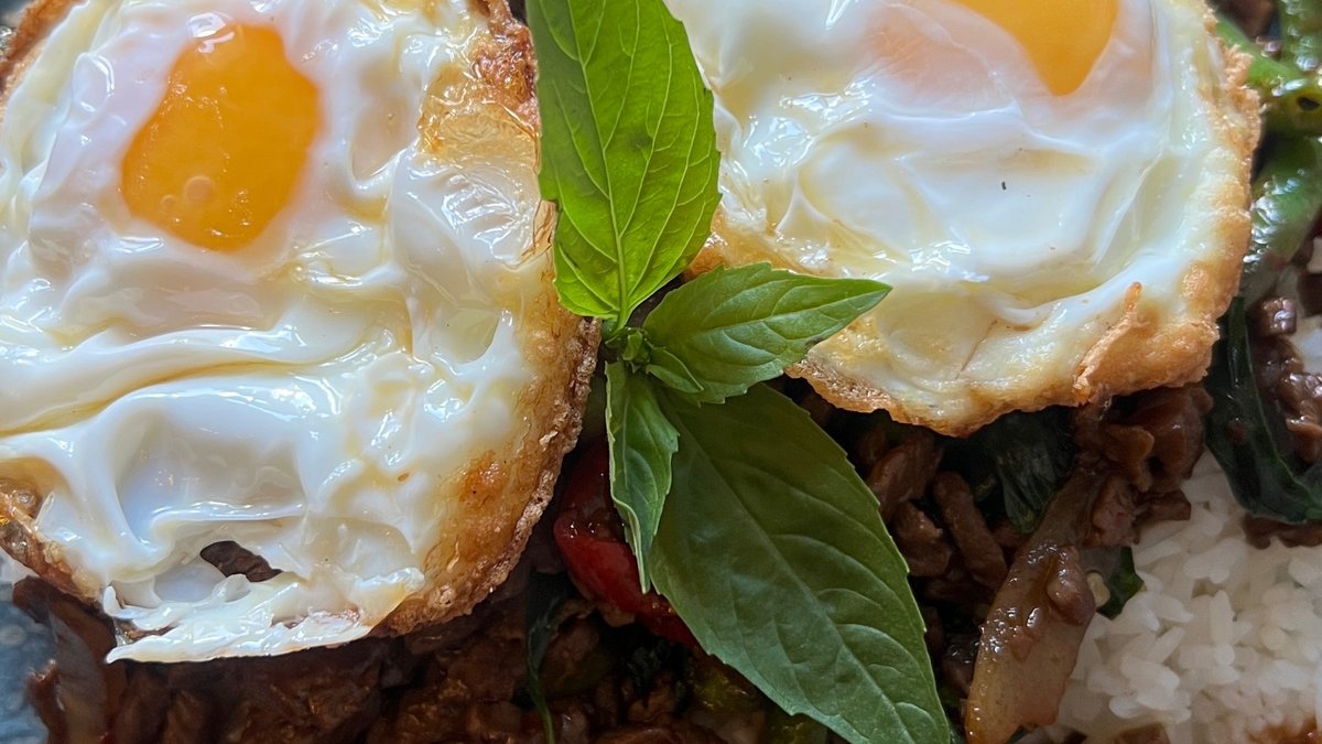 Fried minced beef with chili,garlic, basil,green beans and paper fruit served with rice and topped with fried egg