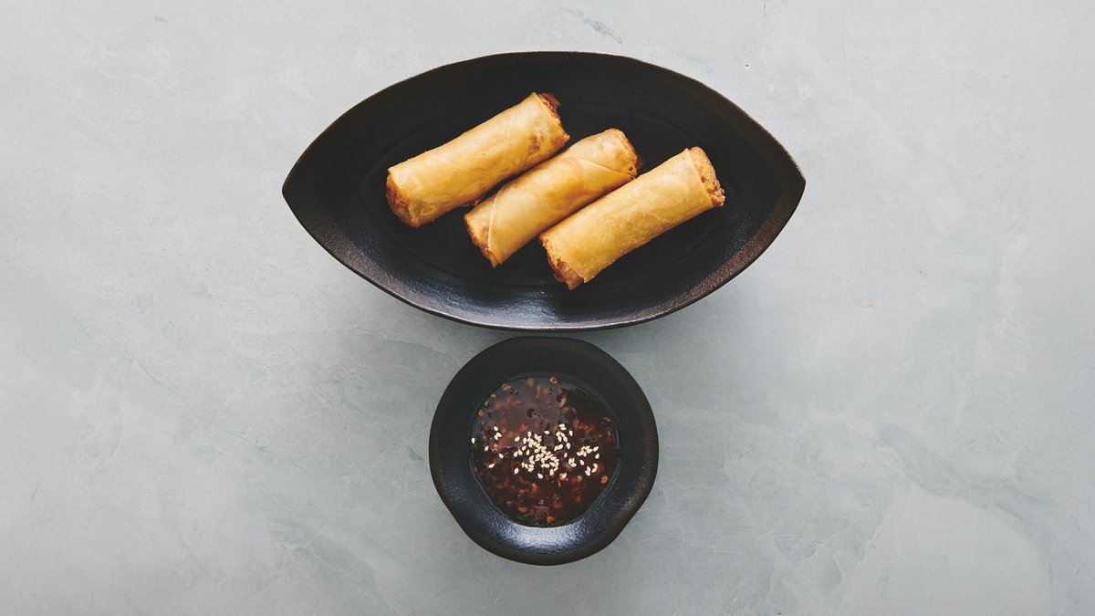Forårsruller med indhold af svinekød og grøntsager. Serveres med sød chilidip.