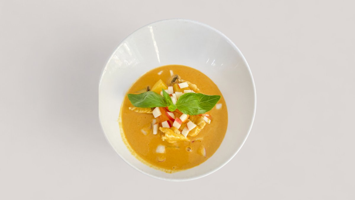 Valgfri vegetarisk protein, kokosmælk, kondenseret mælk, broccoli, blomkål, gulerødder, peberfrugt og jasminris (G). Serveres med valgfri drikkevare.