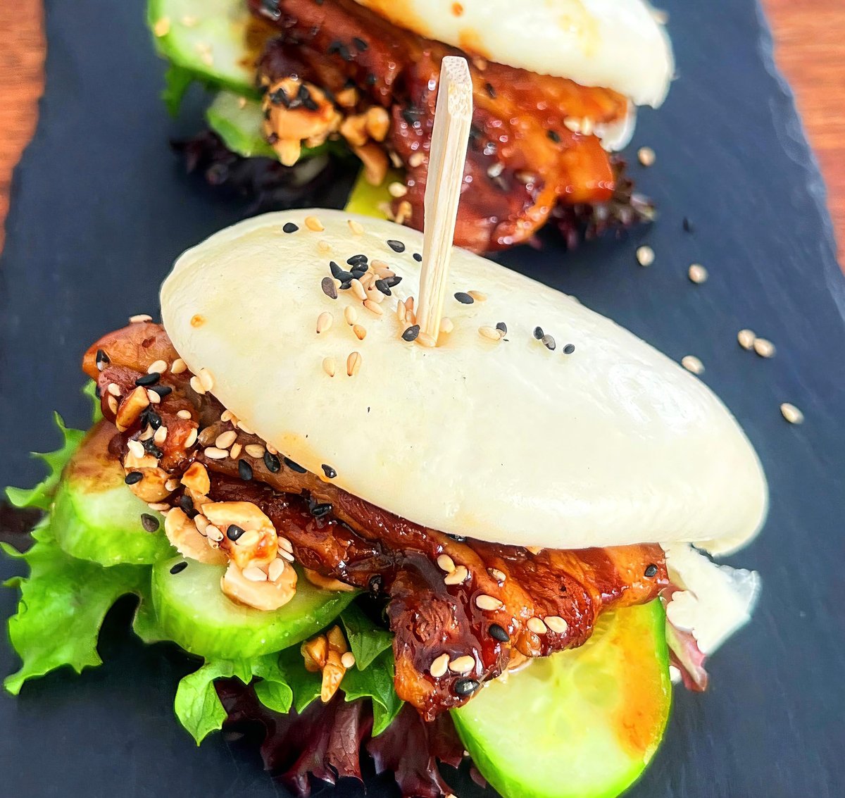 Soft fluffy Bao buns stuffed with tender sticky pork belly,cucumber, peanuts and sesame