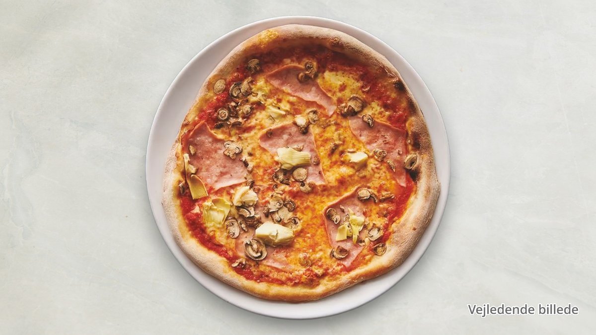 Tomatsauce, mozzarella, skinke, champignon og artiskok.