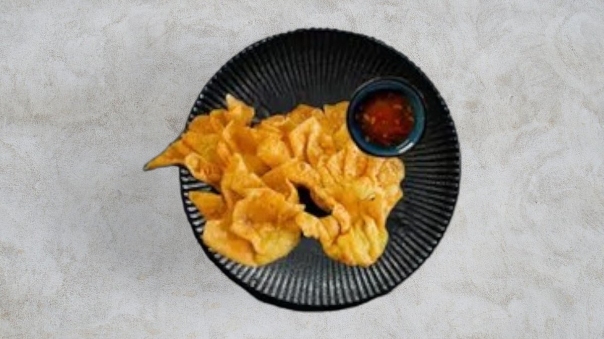 Yakisoba-kylling serveret med 5 wontons og 2 oksekøds-stick.