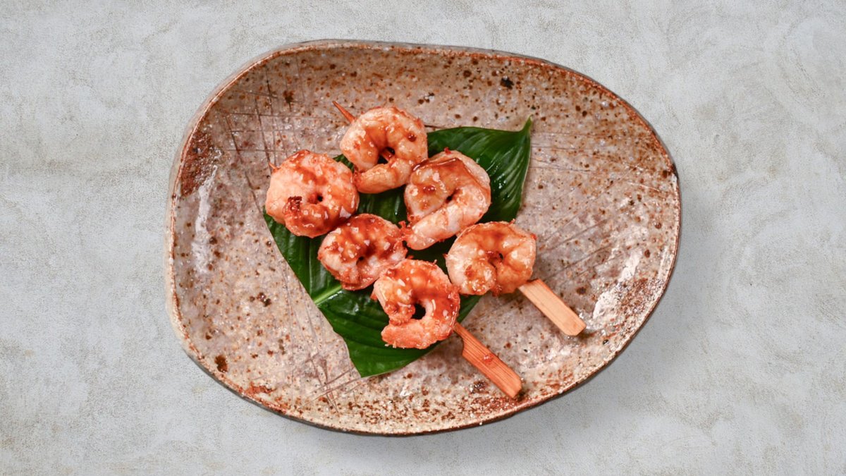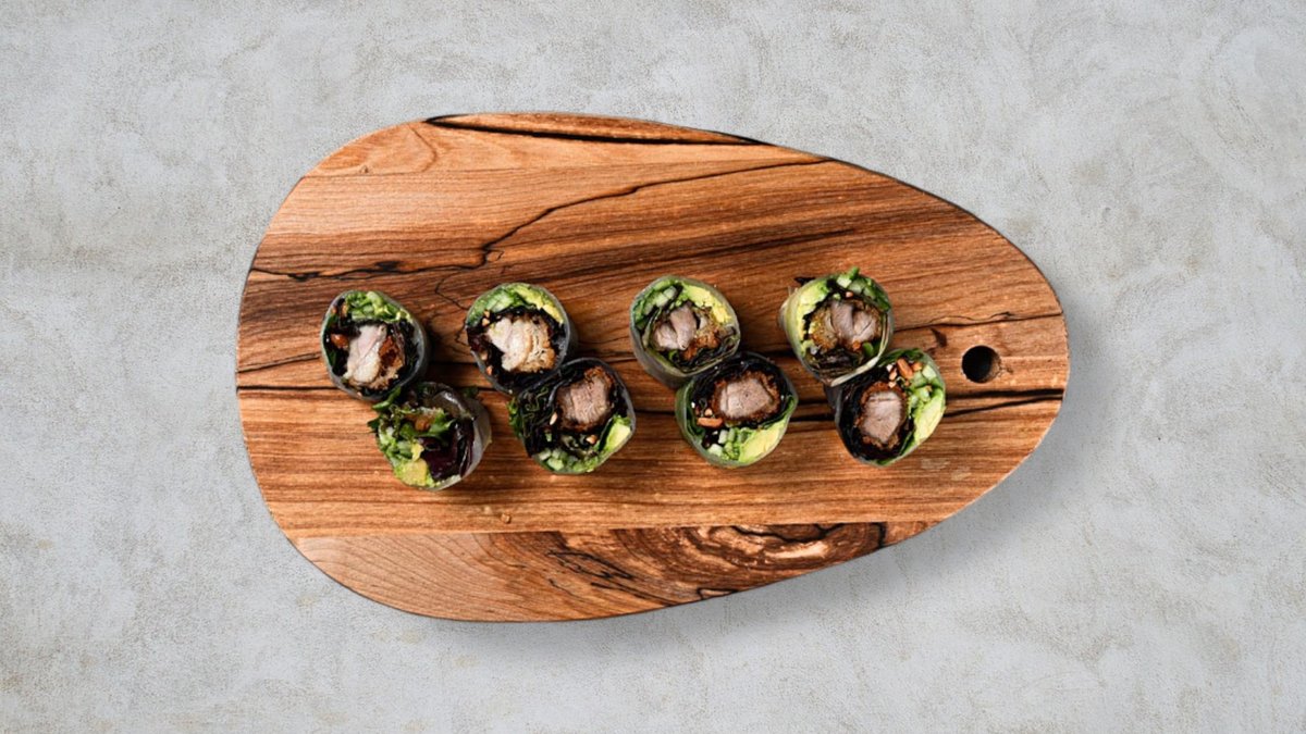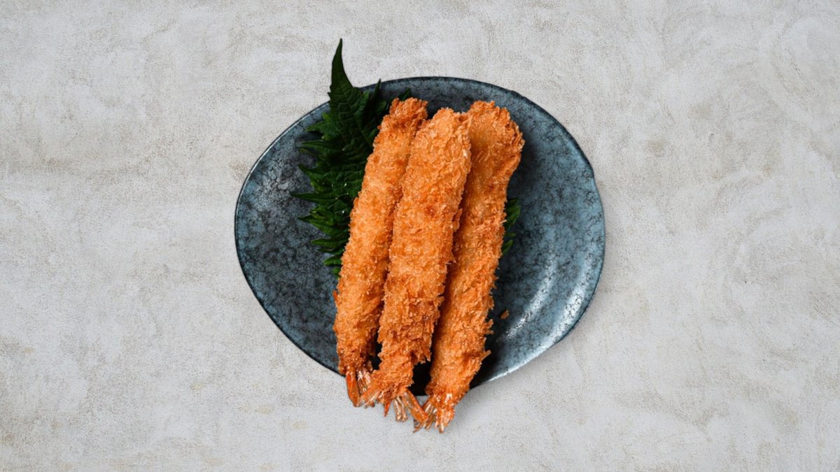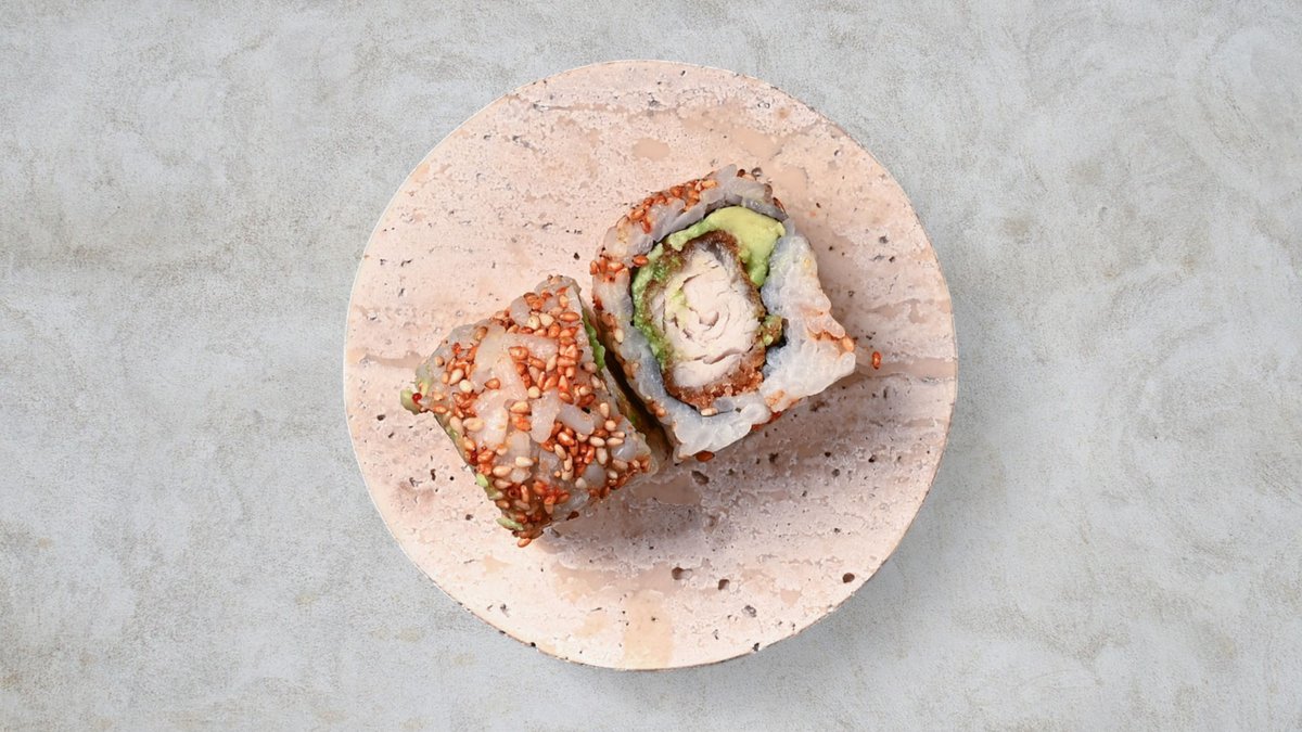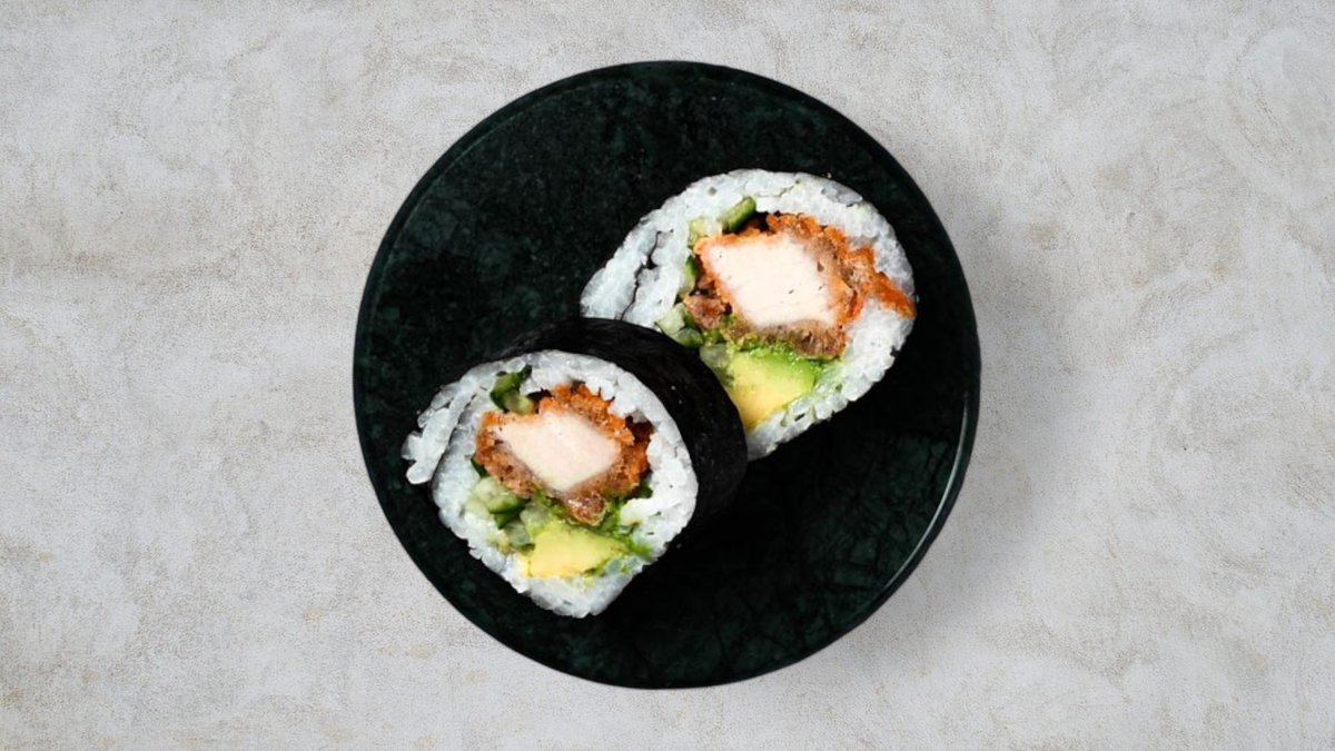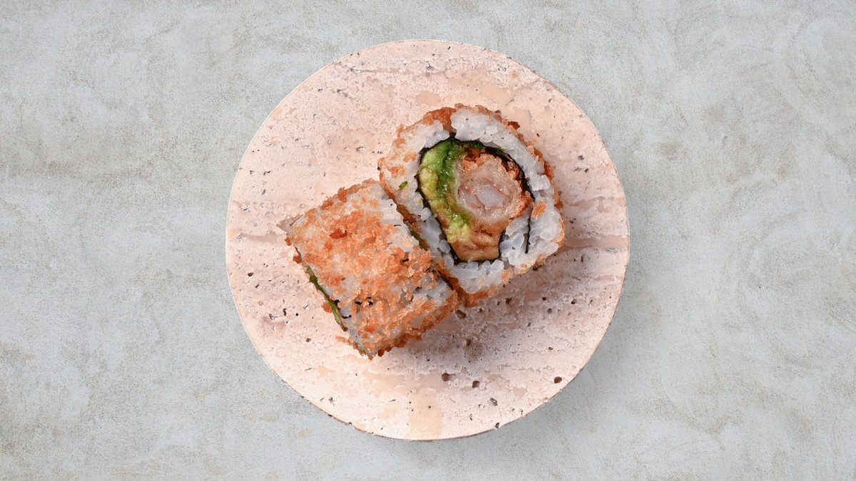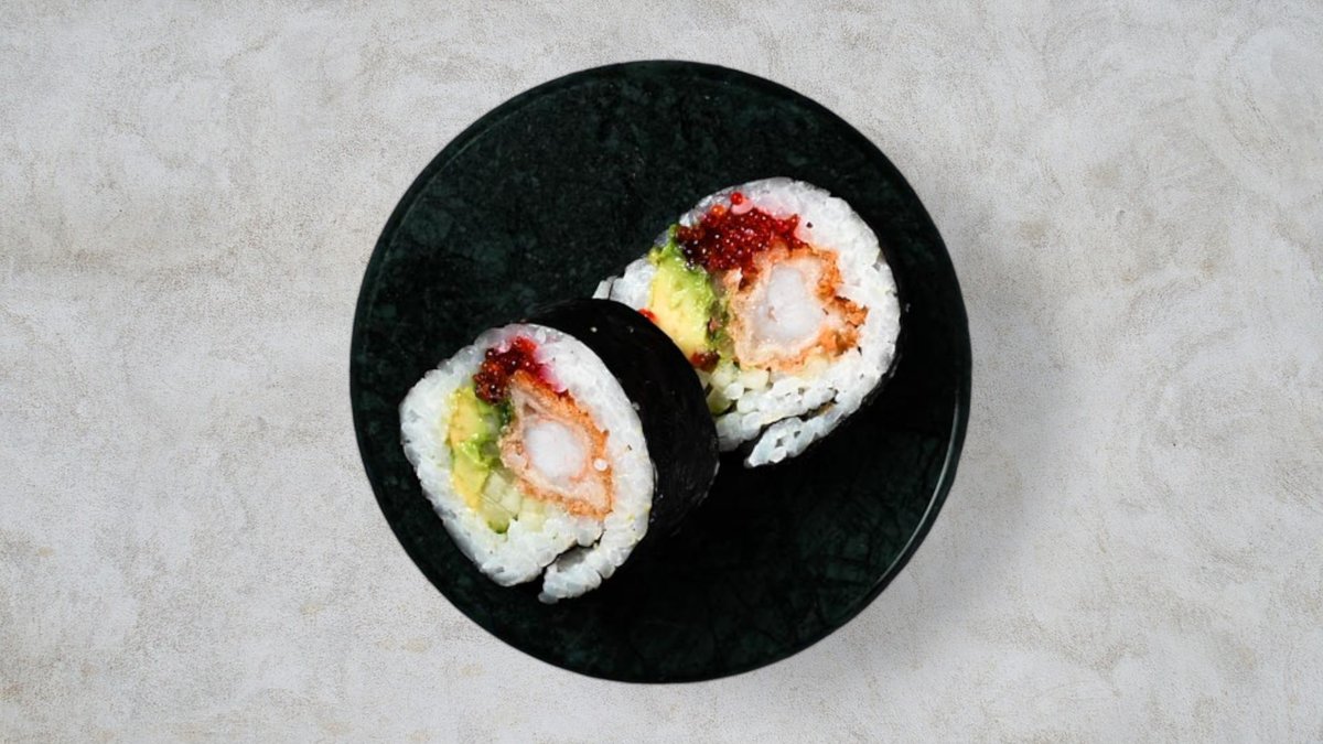 Indbagt crispy tigerreje, avocado og agurk med teriyaki.