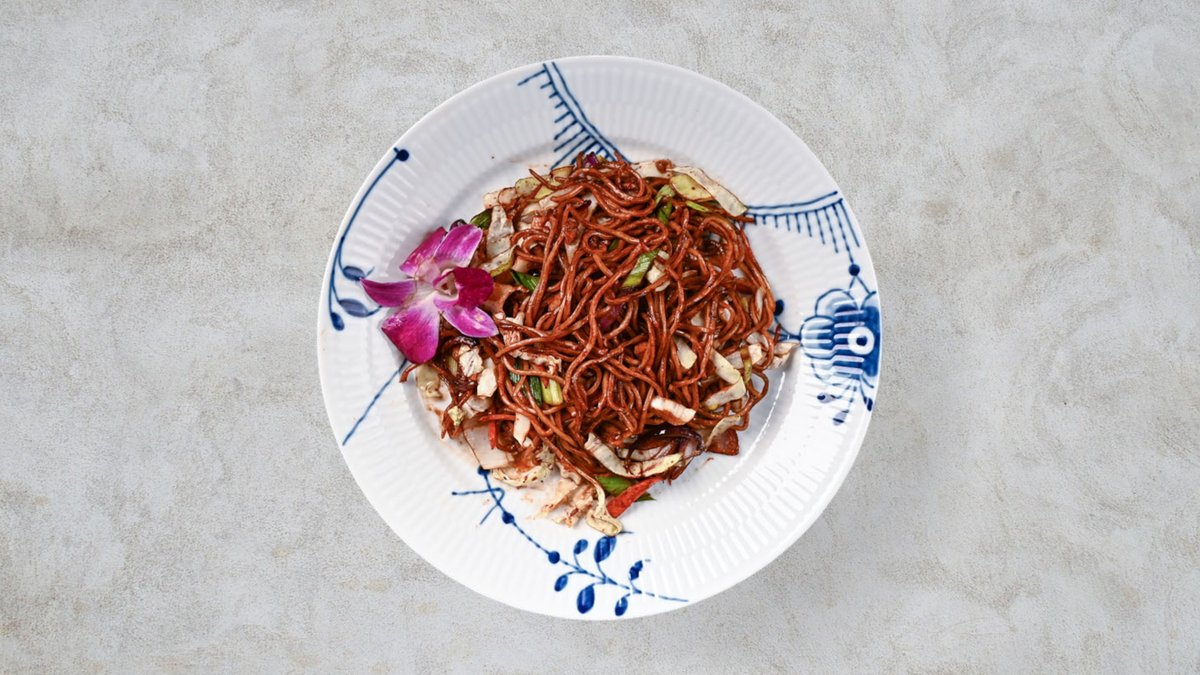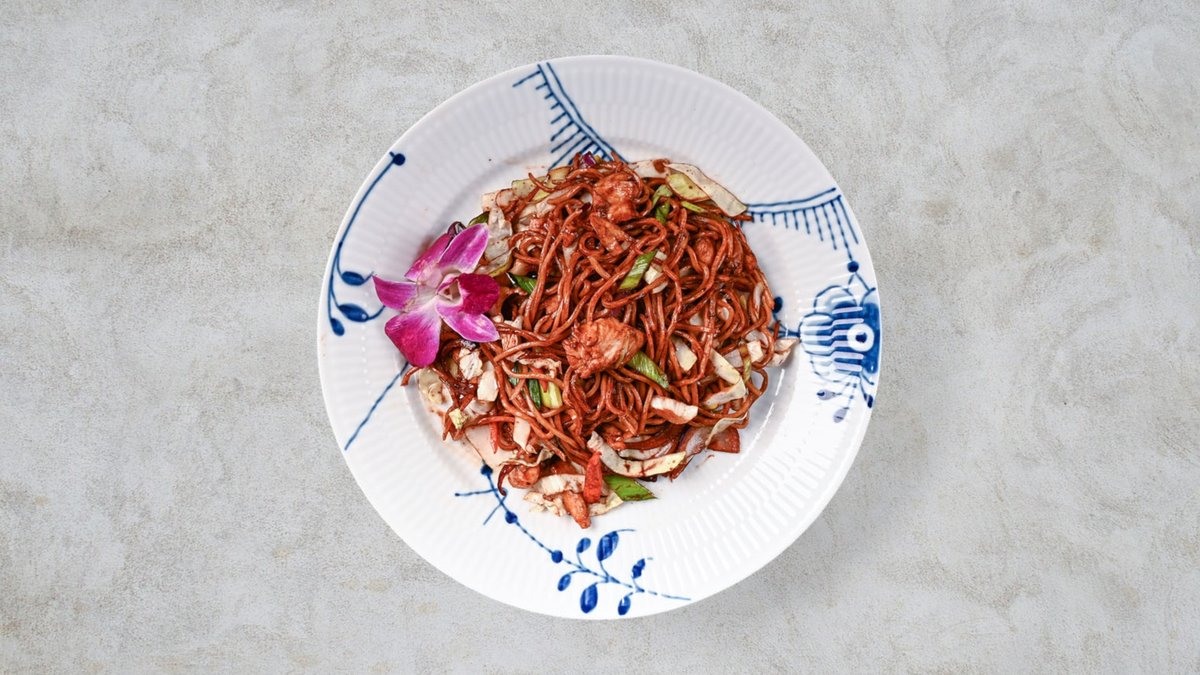 Wokstegte nudler serveret med oksekød og grøntsager.