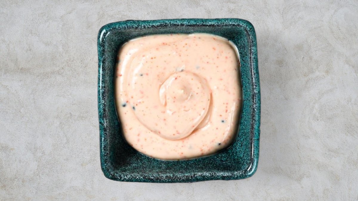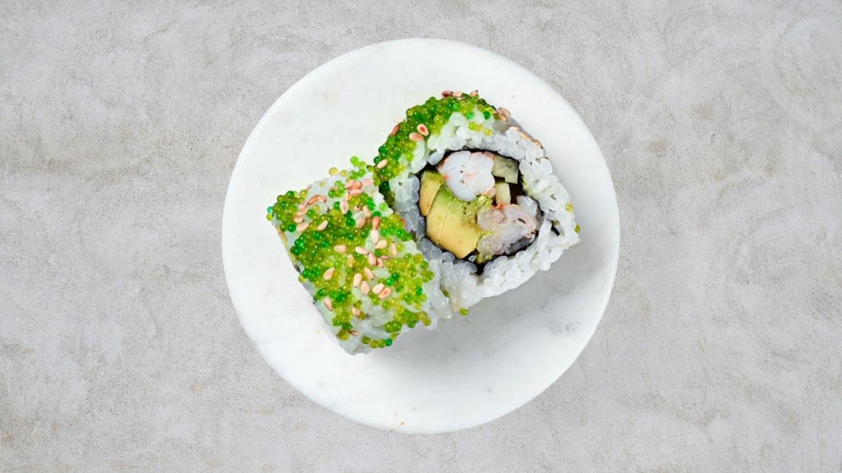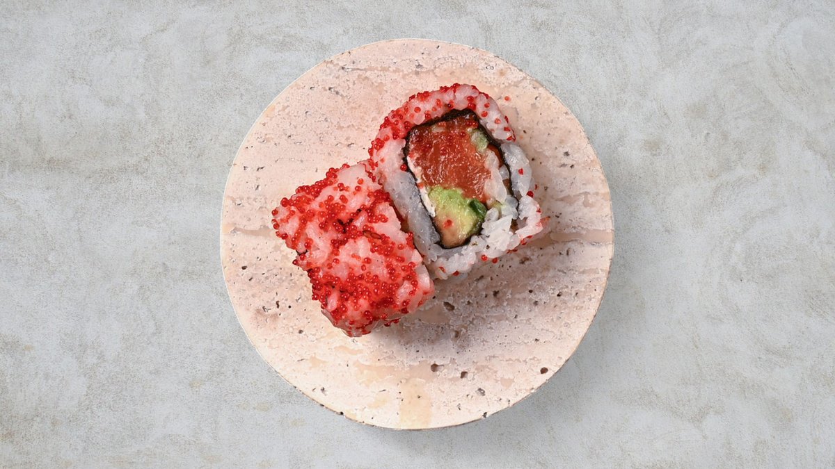 Tun, cashewnødder, avocado, flyvefiskerogn, flødeost og forårsløg vendt med yuzu-dressing.