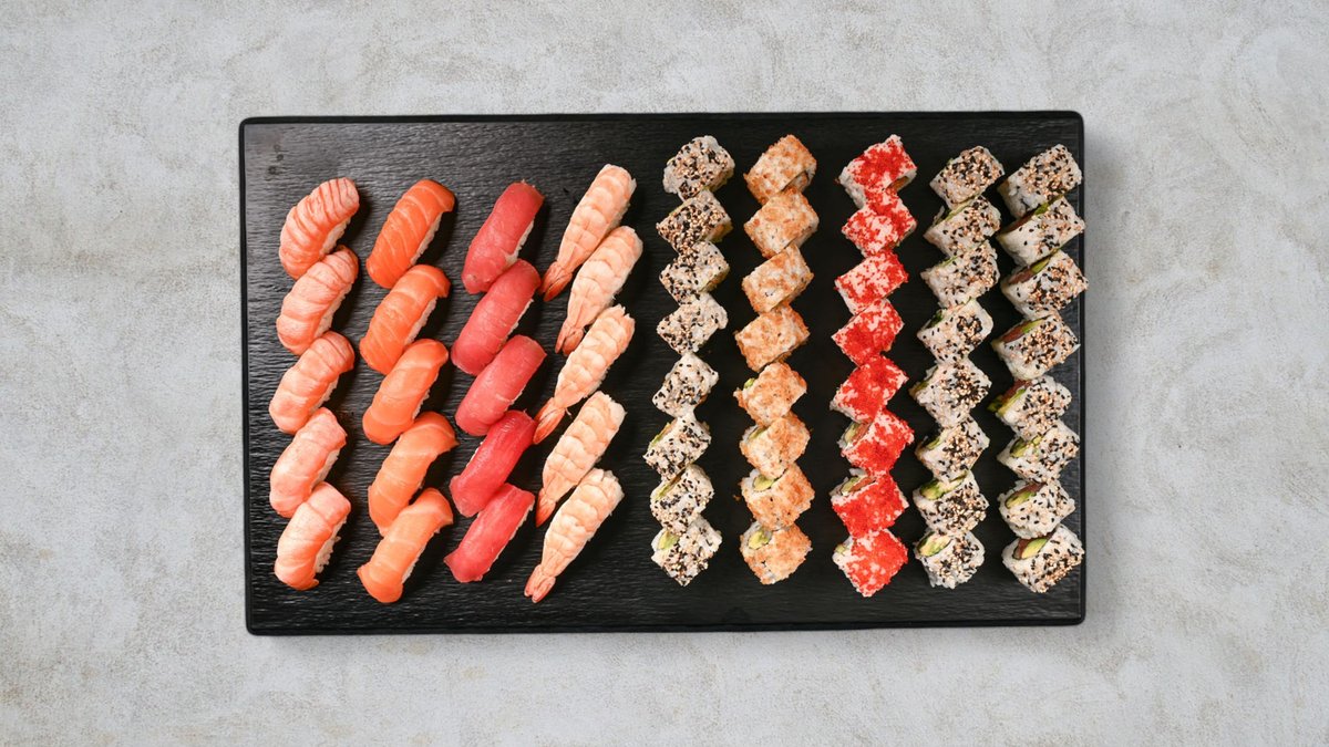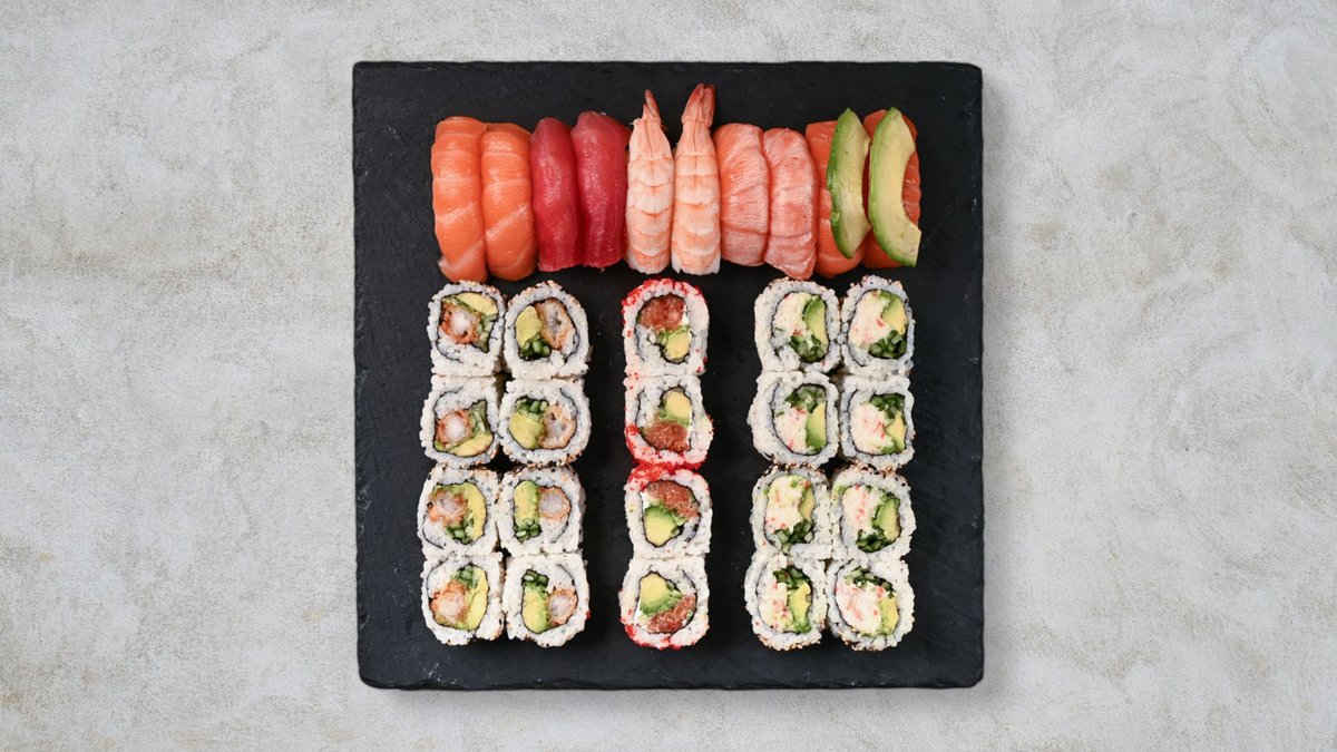 40 x uramaki efter kokkens valg og 20 x nigiri efter kokkens valg.
