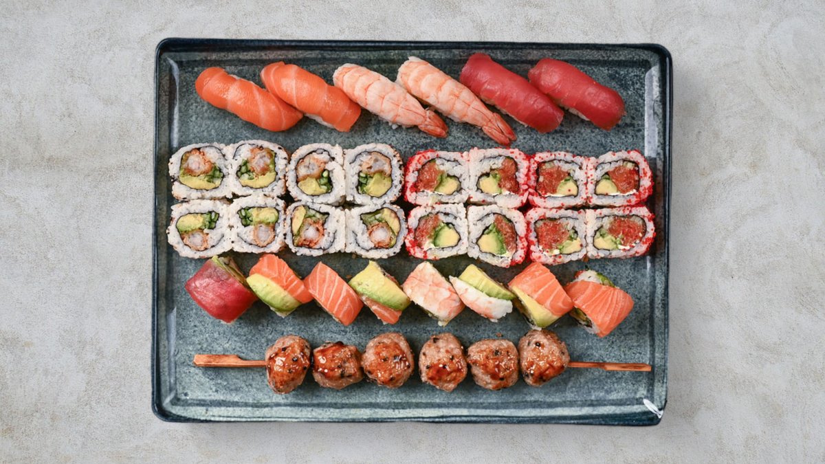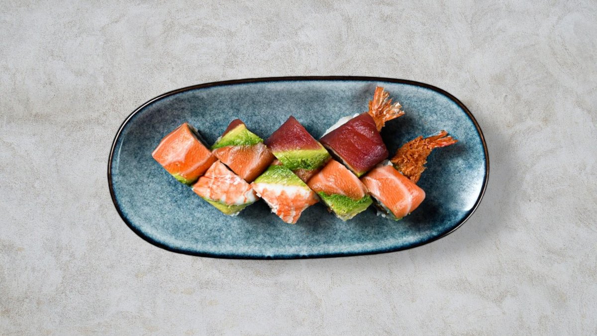 Kaburimaki: 8 x Rainbow Uramaki: 8 x tempura-ebi 8 x Tasty Nigiri: 2 x laks 2 x tun med chilimayo 2 x reje Sticks: 2 x kyllingekødboller
