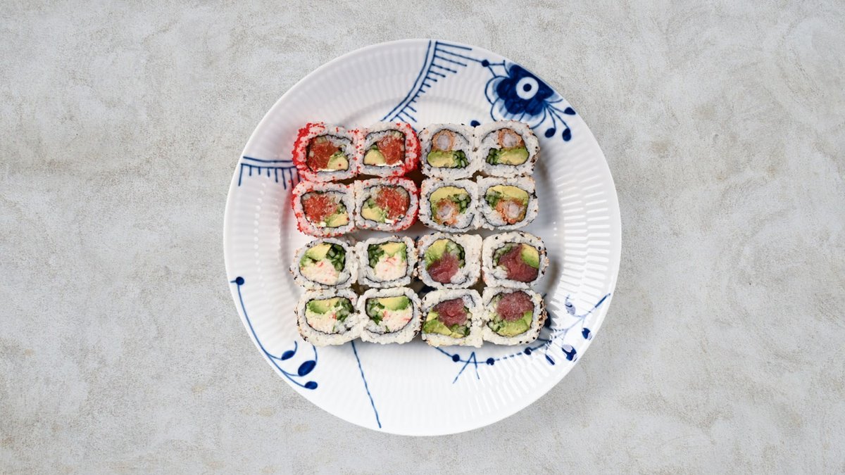 12 x uramaki efter kokkens valg og 8 x nigiri efter kokkens valg.