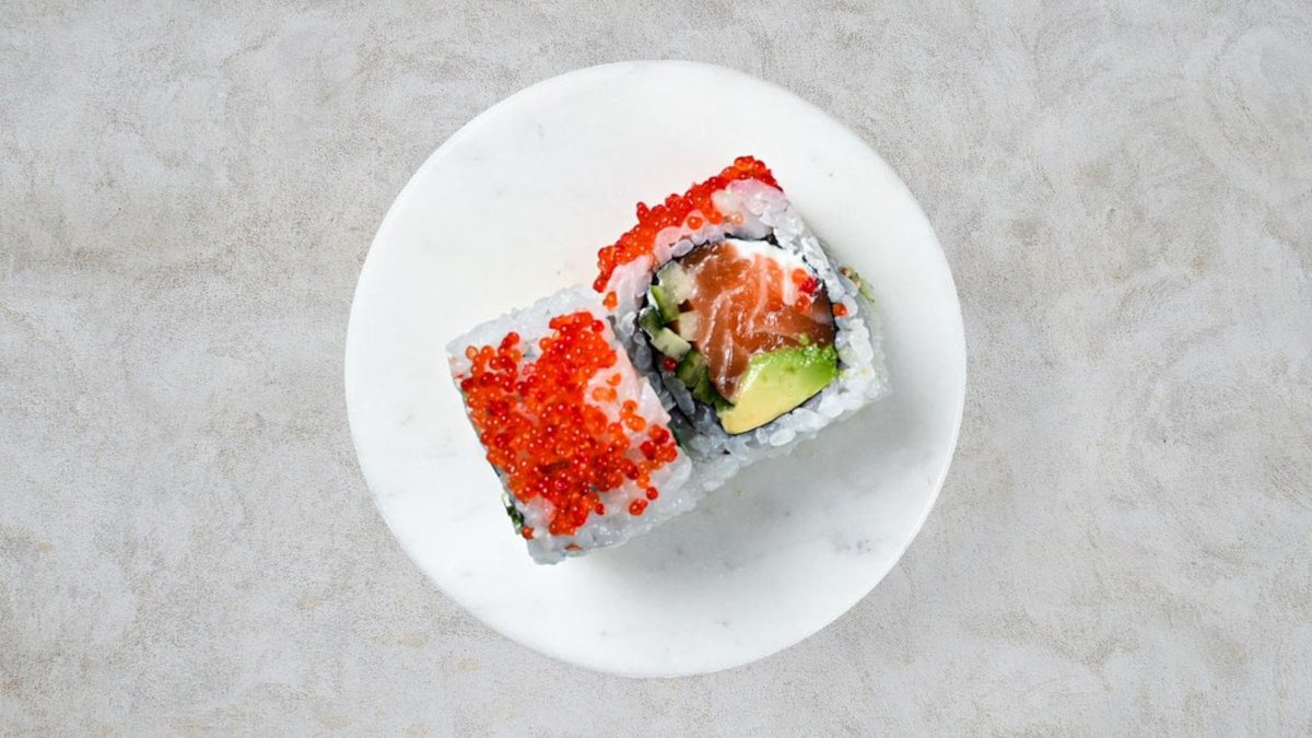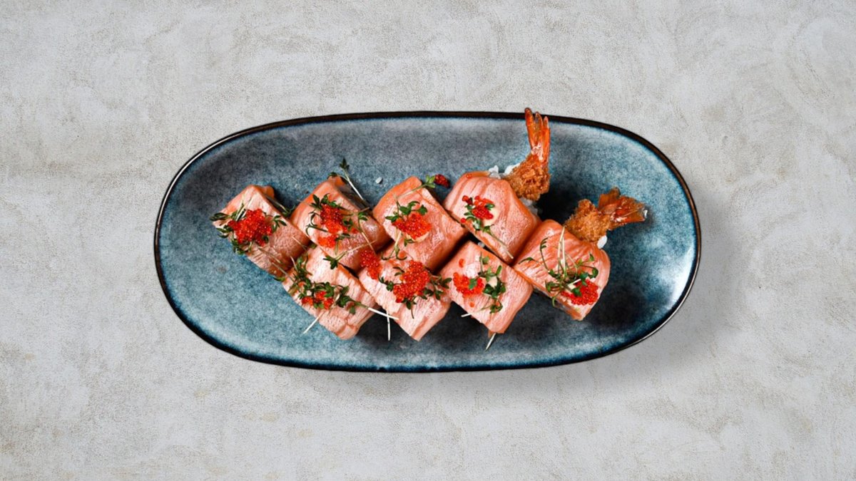 8 x Kingroll med indbagte rejer, avocado og agurk. Toppes med laks og chilimayo.