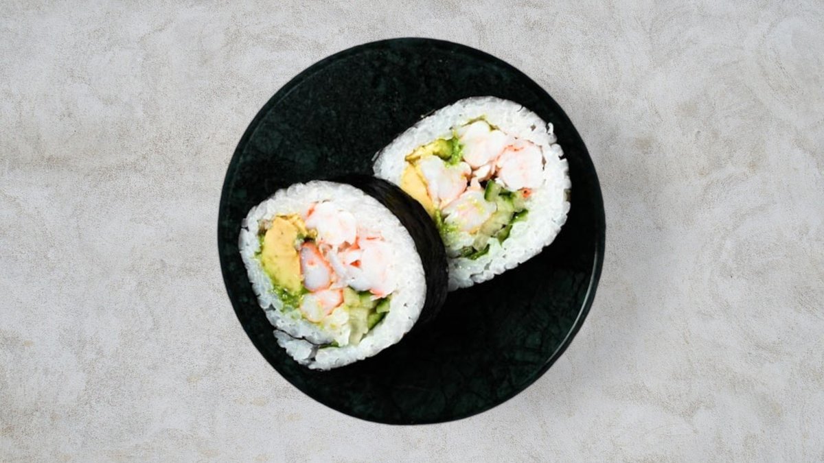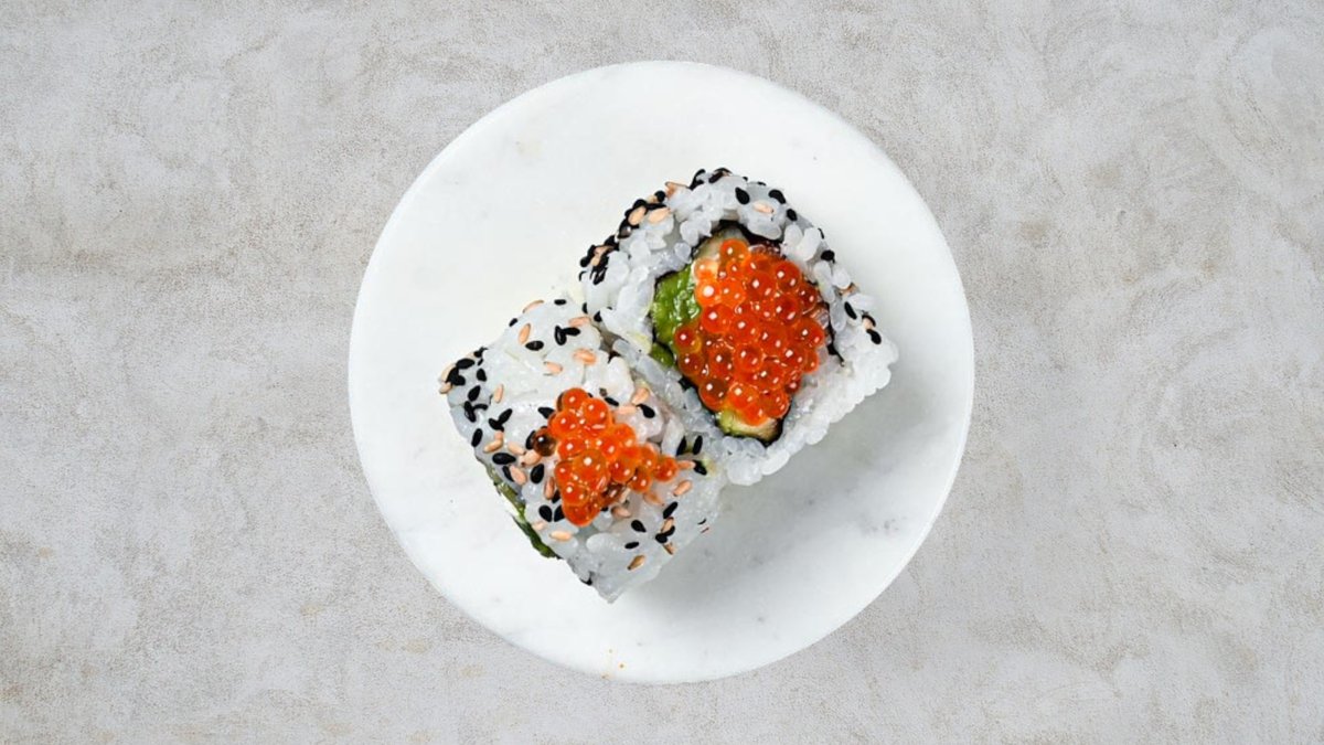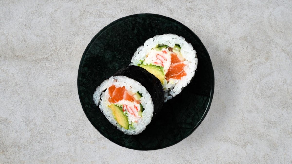 Laks, snekrabbe, flyvefiskerogn, mix-salat, agurk avocado og japansk mayonnaise..