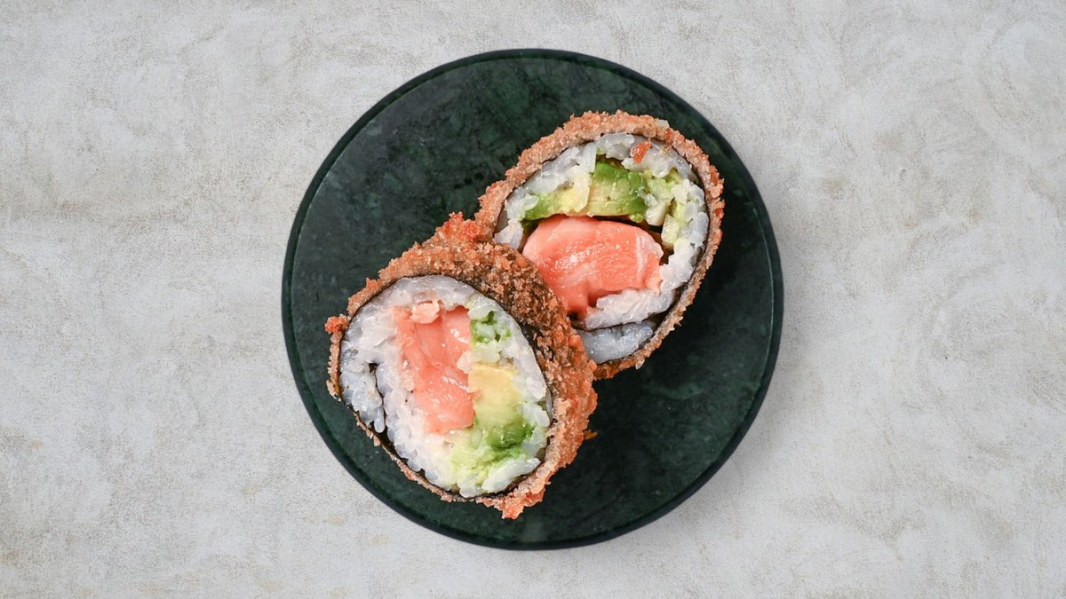Laks, forårsløg, koriander og agurk dybstegt i sprød panko serveret med wasabilime