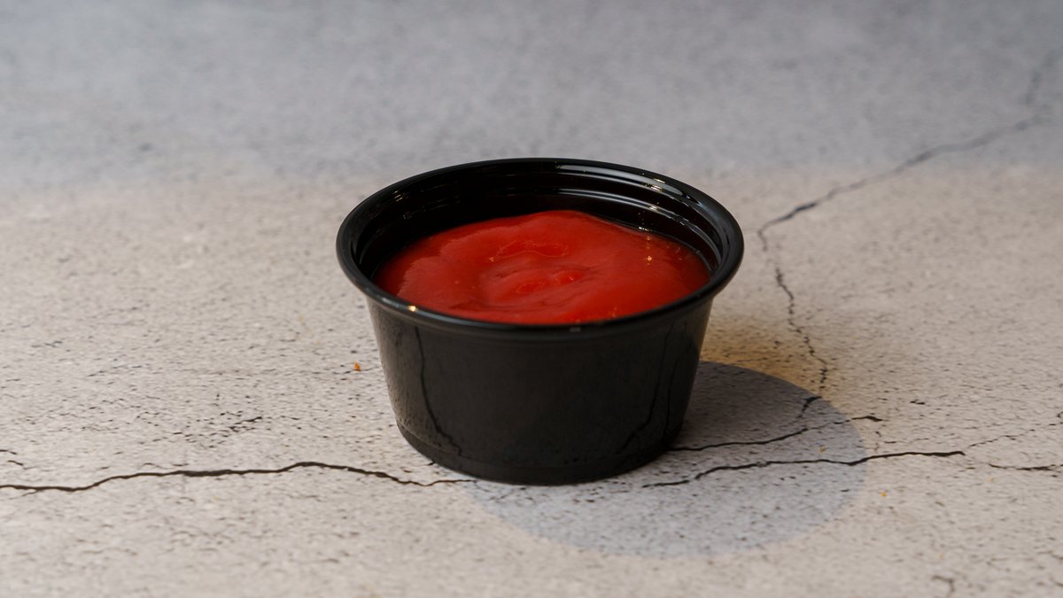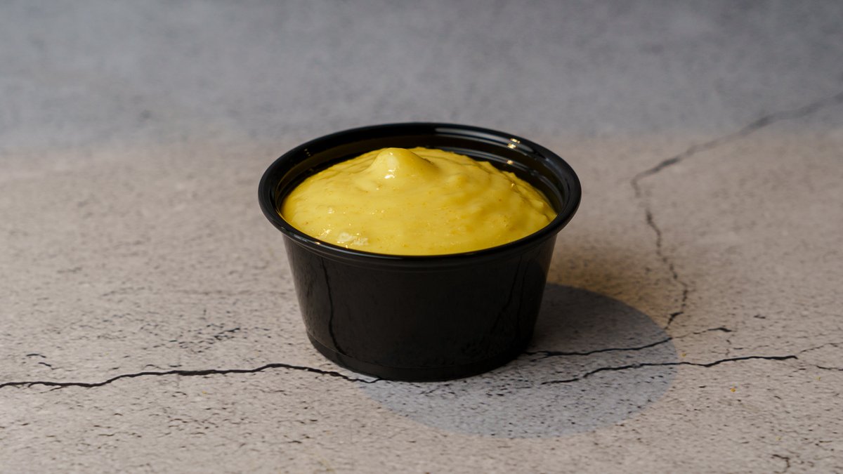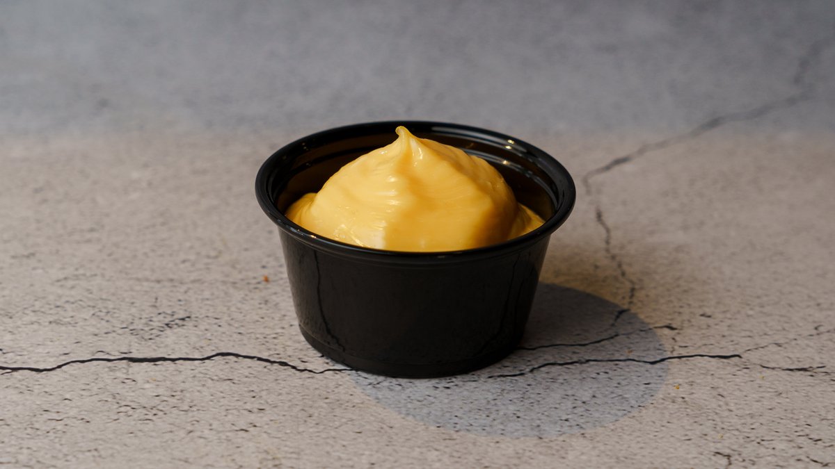 Sennep, ketchup, rødløg, hjemmelavet agurkesalat, tomat, salat, mayonnaise, ost og to bøffer af fersk gastrokalv serveret i en briochebolle.