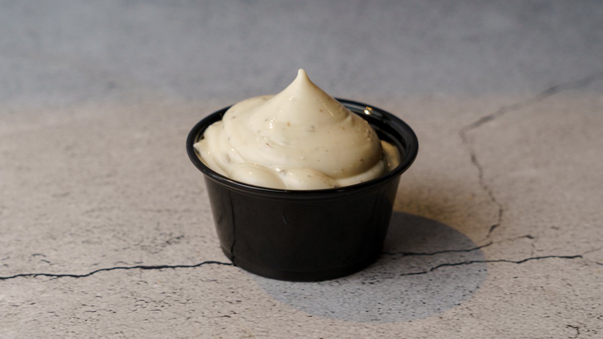 Barbequesauce, hjemmelavet agurkesalat, tomat, mayonnaise, salat, bløde løg, bacon, ost, spejlæg, en bøf af fersk gastrokalv serveret i en briochebolle.
