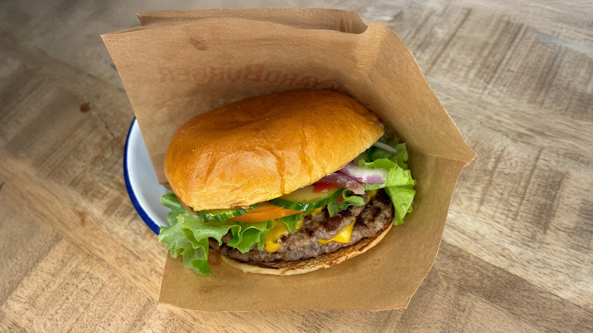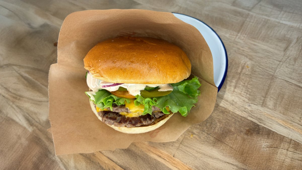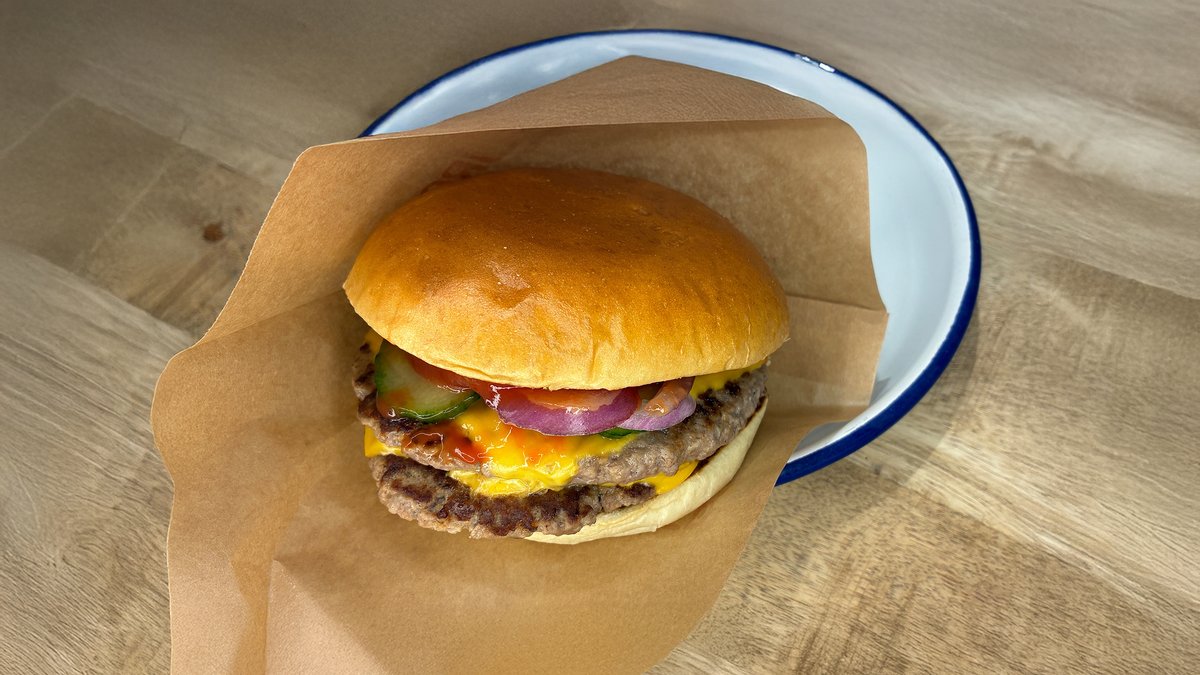 Sennep, ketchup, rødløg, hjemmelavet agurkesalat, ost og to bøffer af fersk gastrokalv serveret i en briochebolle.