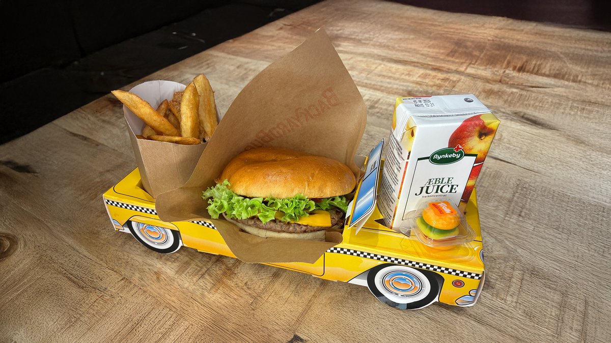 Børneburger med ost, ketchup, tomat og salat, lille pommes frites og en æble brikjuice serveret i en bil. Gælder kun for børn t.o.m 12 år!