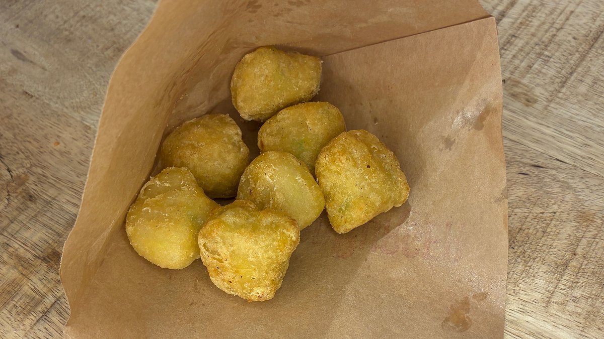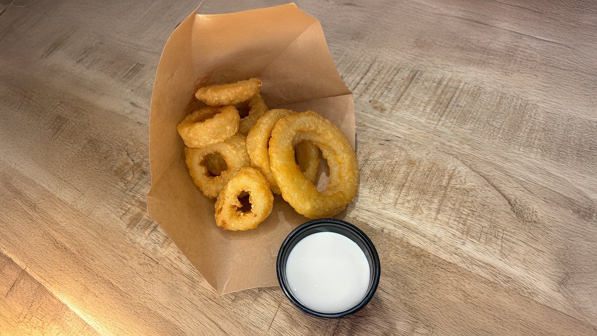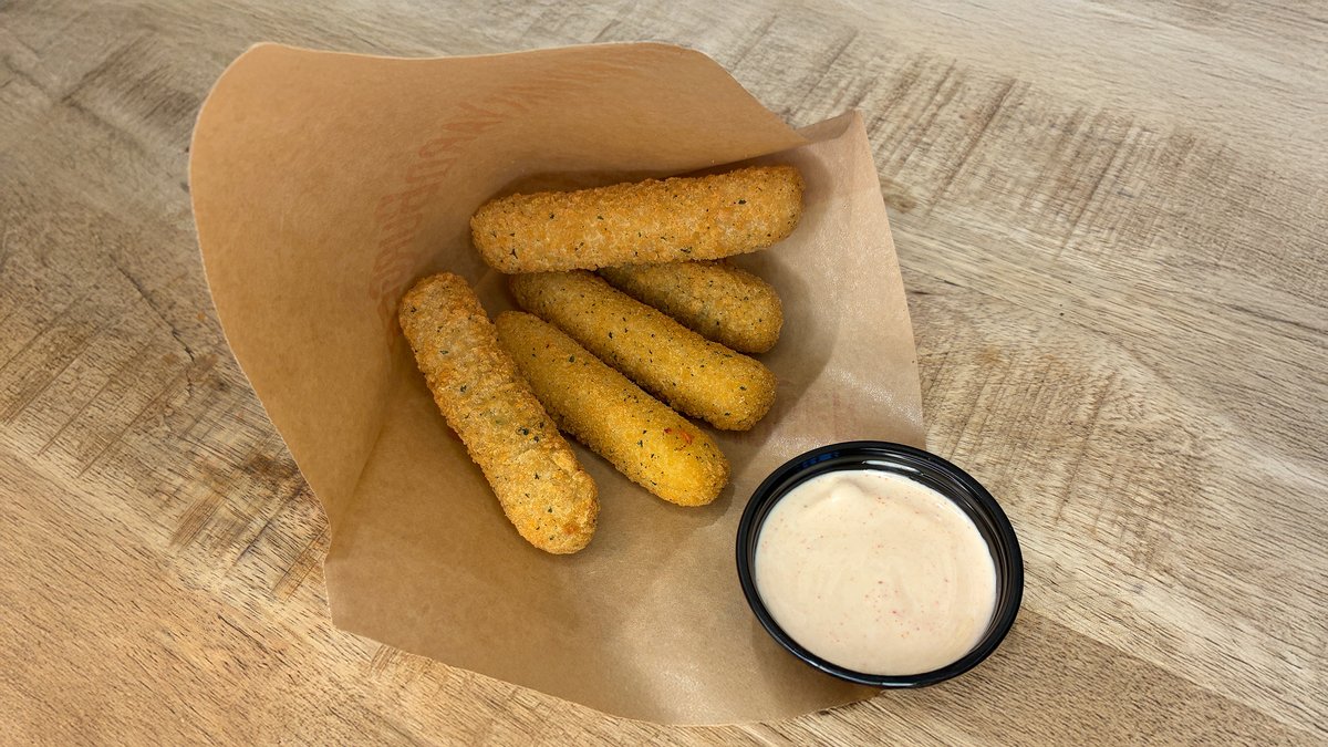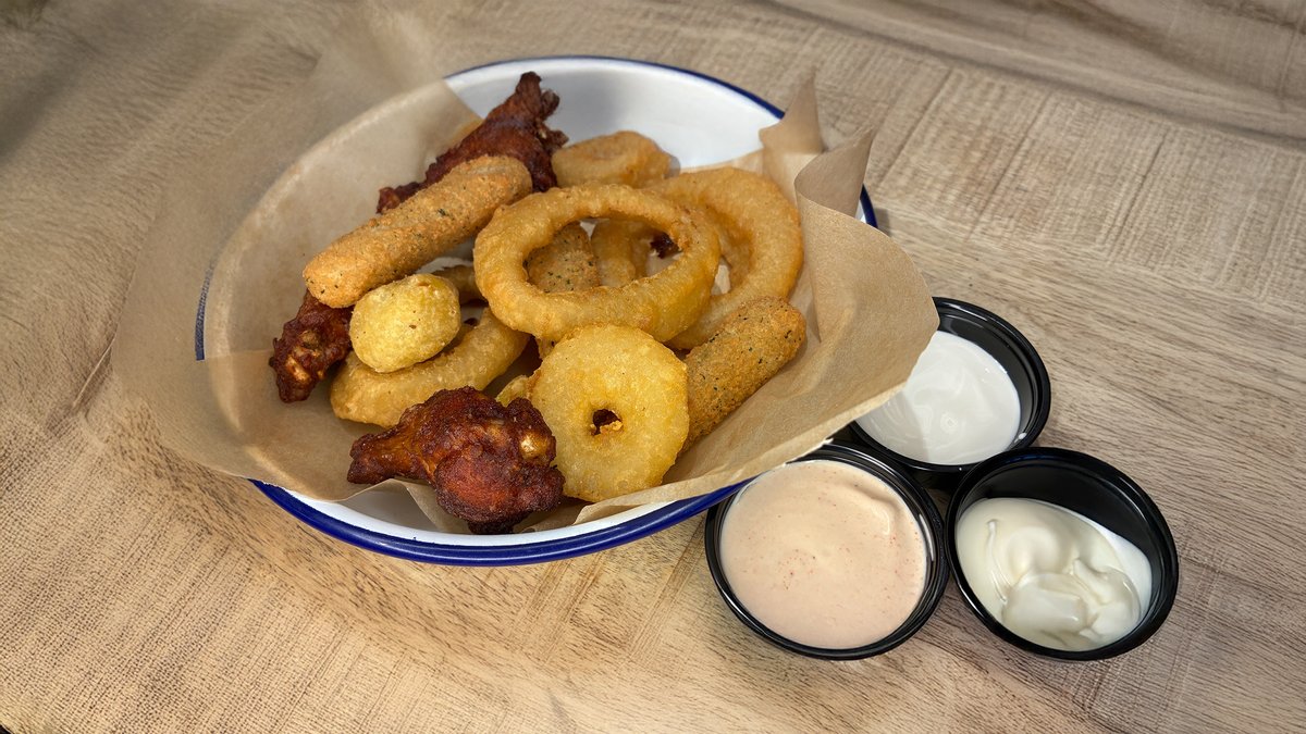 3 Hot wings, 3 Chilli cheese tops, 3 Mozzarella sticks og 5 løgringe. Hertil serveres chillisause, hvidløgsdressing og mayonnaise.