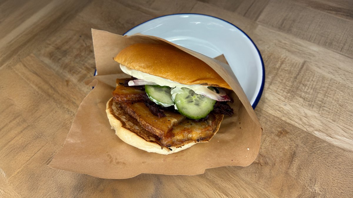 Mayonnaise, rødløg, hjemmelavet agurkesalat, rødkål og ribbenssteg serveret i en briochebolle.